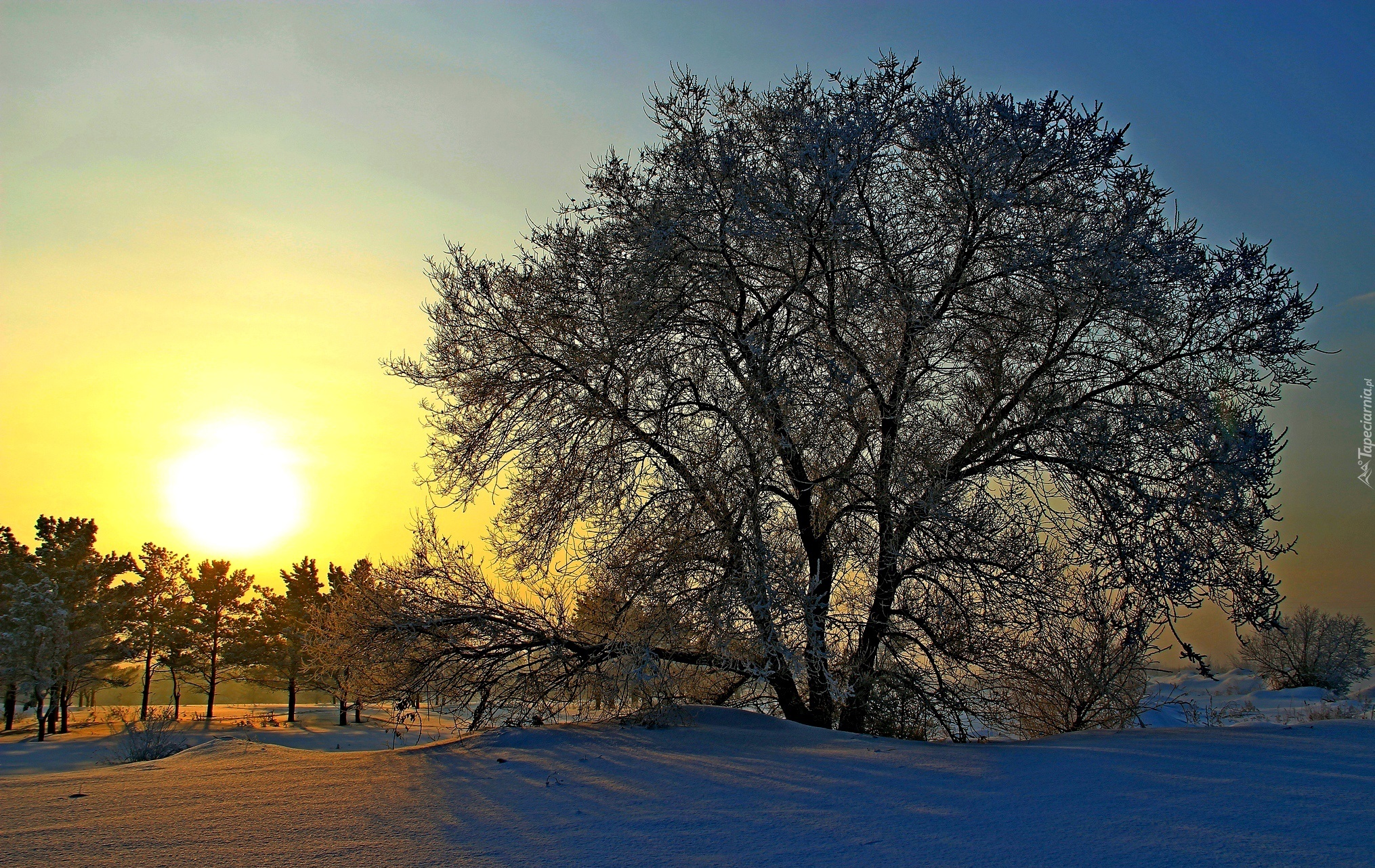 Edytor tapety: Zima, Wschód słońca, Drzewa, Śnieg