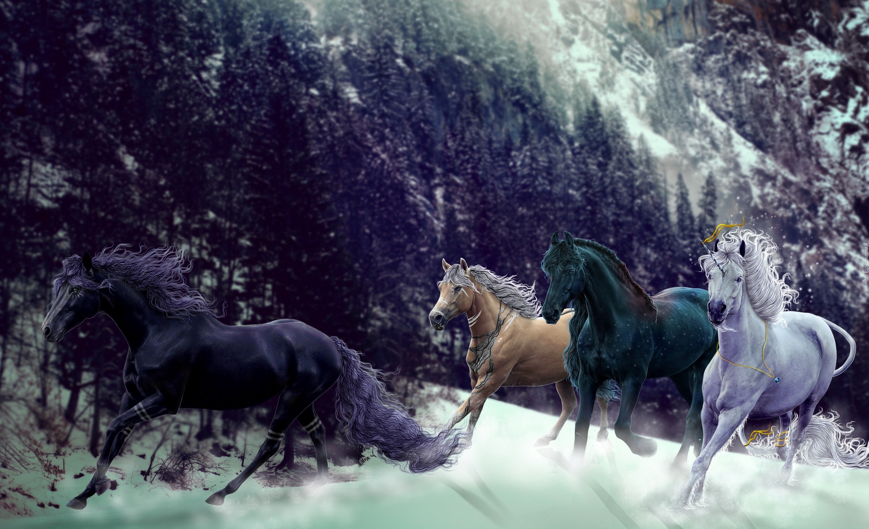 Edytor tapety: Konie, Śnieg, Góry, Drzewa