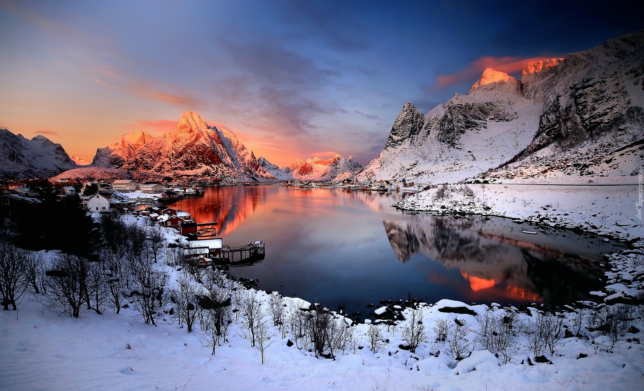 Edytor tapety: Zima, Śnieg, Jezioro, Zachód Słońca, Góry