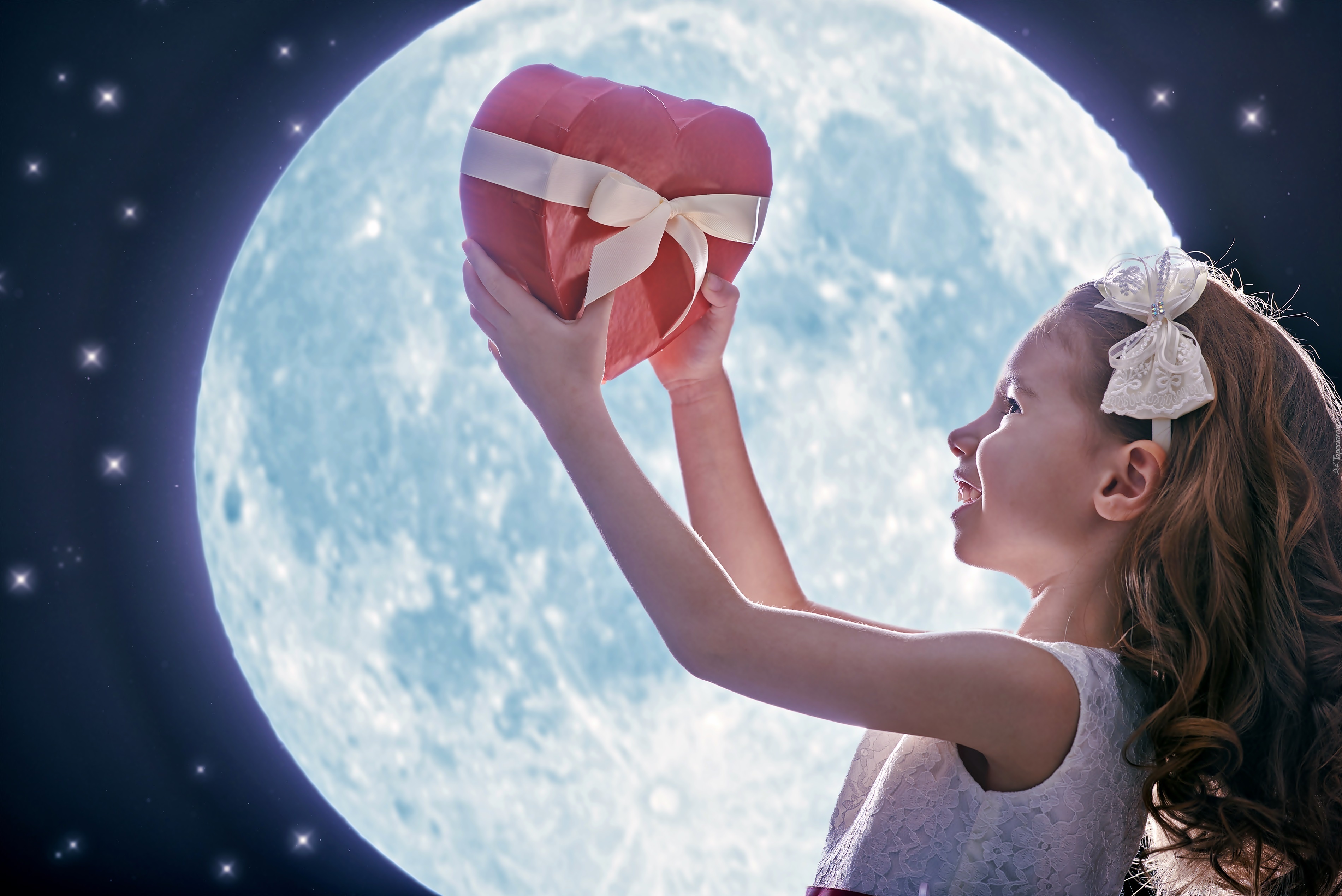 Edytor tapety: Dziewczynka, Niebo, Księżyc, Gwiazdy, Walentynki, Prezent