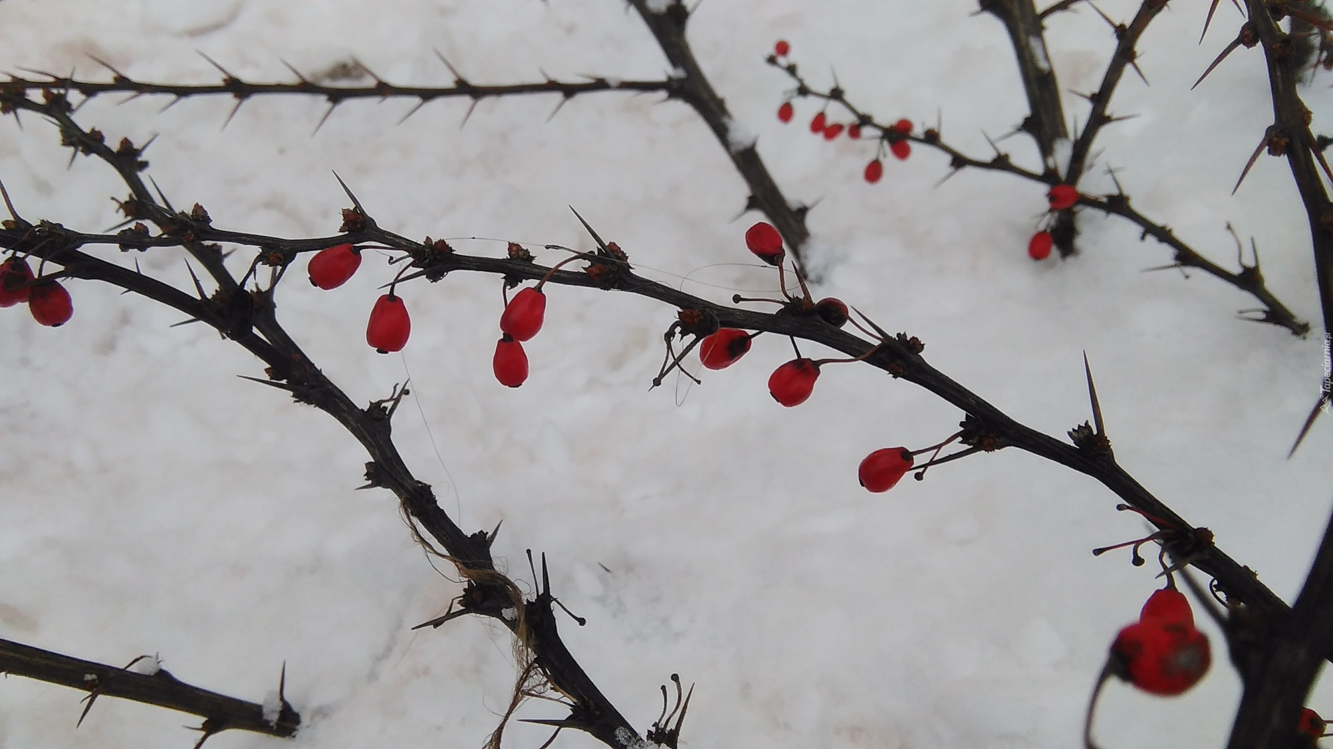 Edytor tapety: Śnieg, Krzew, Kolce, Czerwone, Owoce