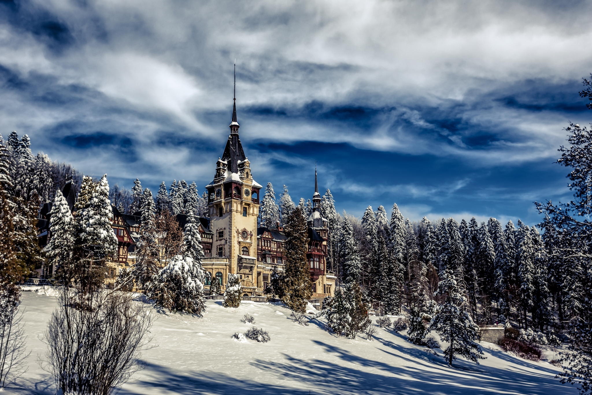 Edytor tapety: Pałac Peles, Castelul Peleş, Miejscowość Sinaia, Rumunia, Zima, Drzewa
