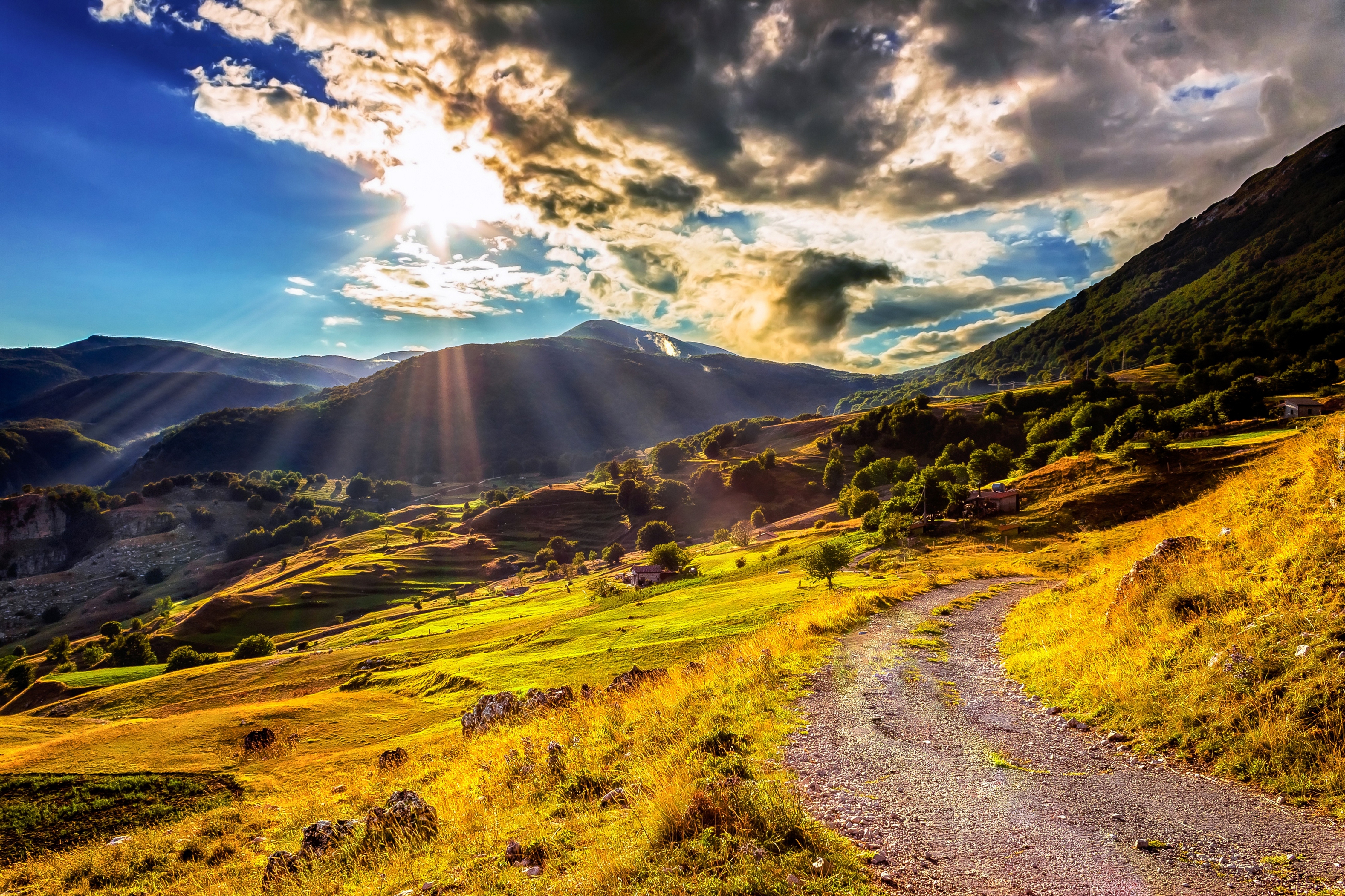 Edytor tapety: Góry, Łąka, Chmury, Niebo