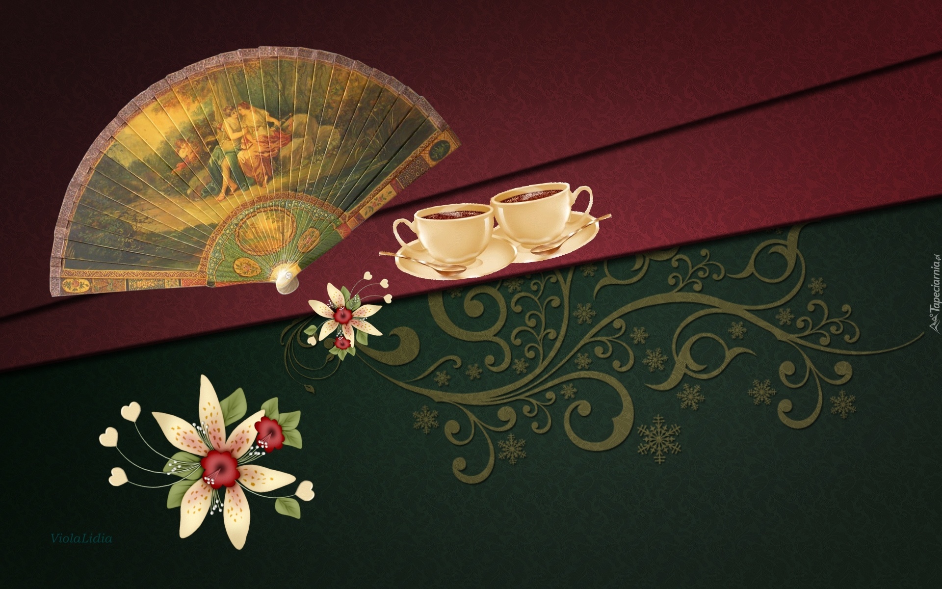 Edytor tapety: Grafika, Filiżanki, Kwiaty, Wachlarz