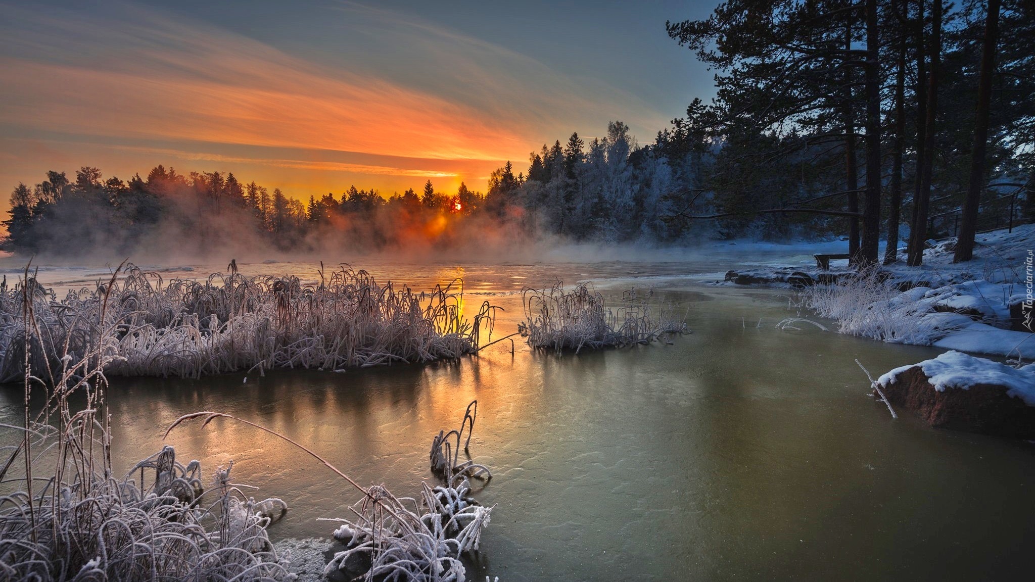 Edytor tapety: Zima, Rzeka, Las, Mgła, Świt