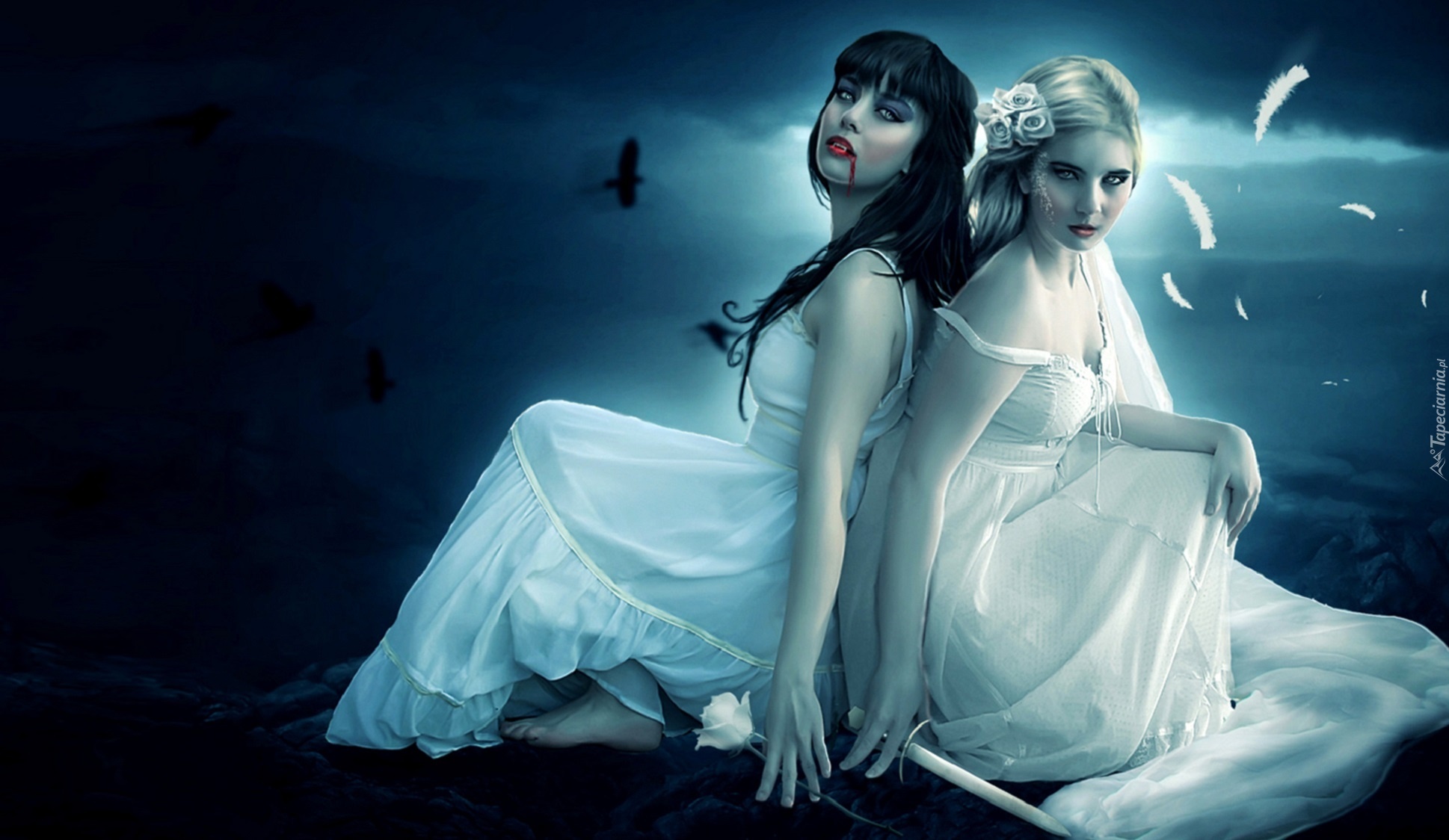 Edytor tapety: Dziewczyny, Wampirzyce, Sztylet, Krew, Ptaki