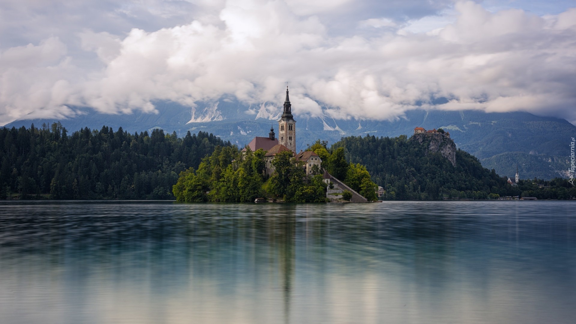 Edytor tapety: Słowenia, Wyspa, Woda, Kościół, Drzewa