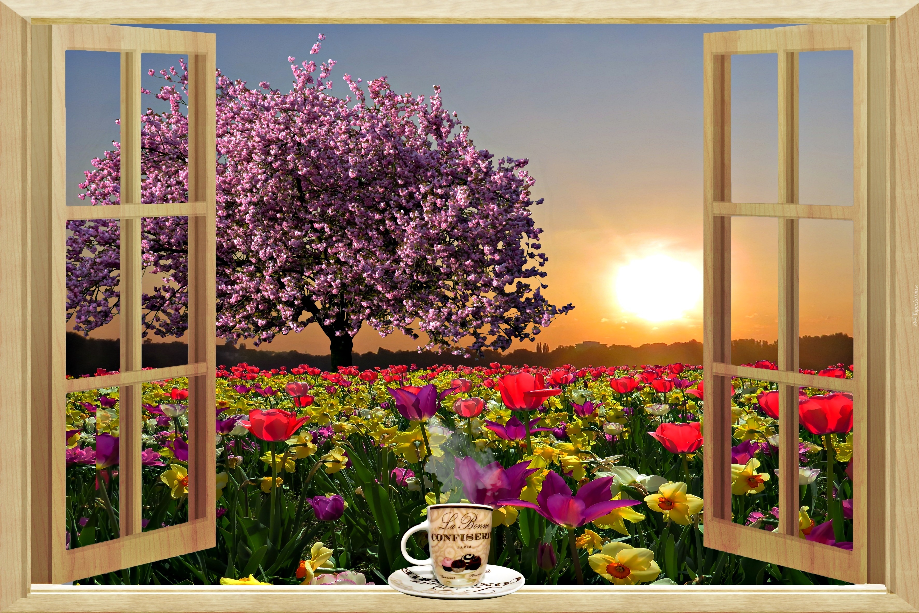 Edytor tapety: Wiosna, Tulipany, Kwitnące, Drzewo, Wschód Słońca, Okno