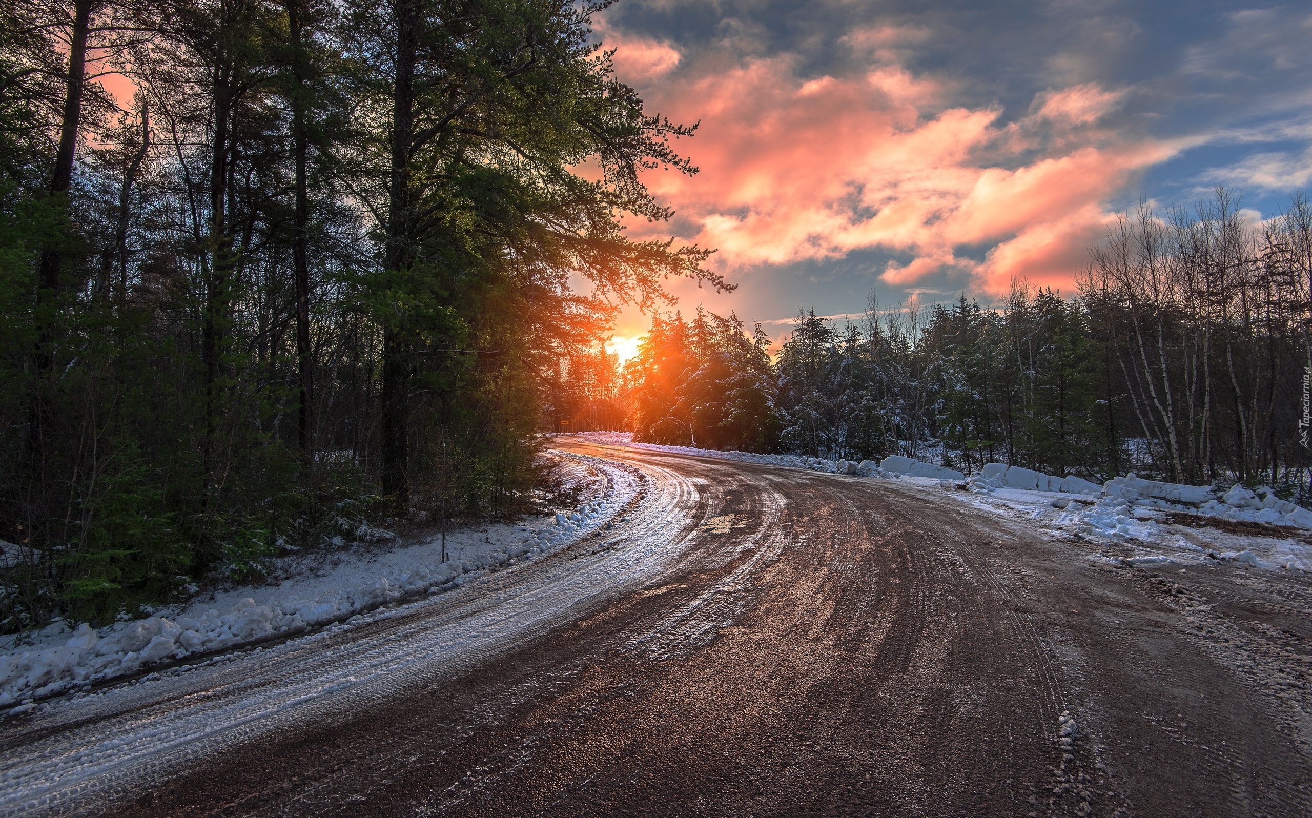 Edytor tapety: Zima, Zachód, Słońca, Droga, Las