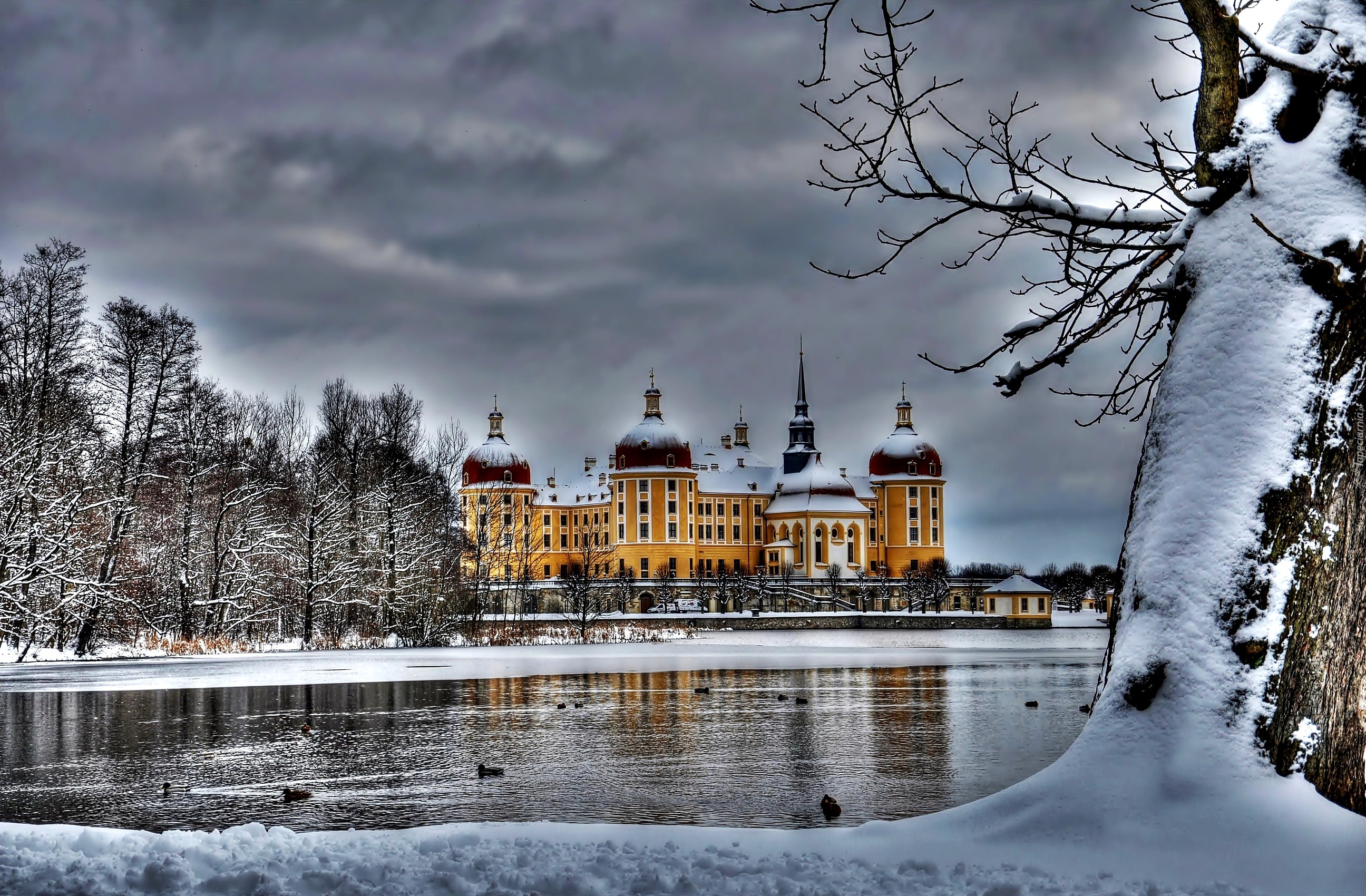 Edytor tapety: Niemcy, Saksonia, Miejscowość Moritzburg, Pałac Moritzburg, Jezioro, Śnieg, Zima, Drzewa