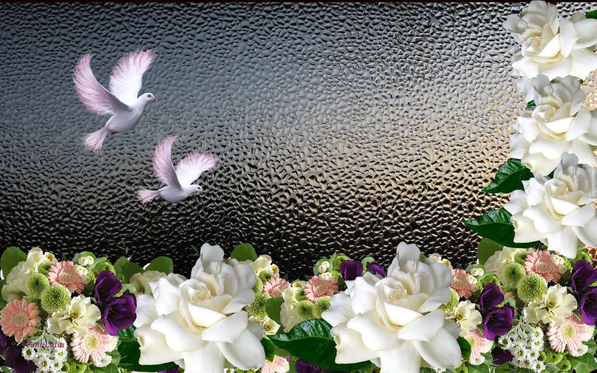 Edytor tapety: Grafika, Kwiaty, Gołębie