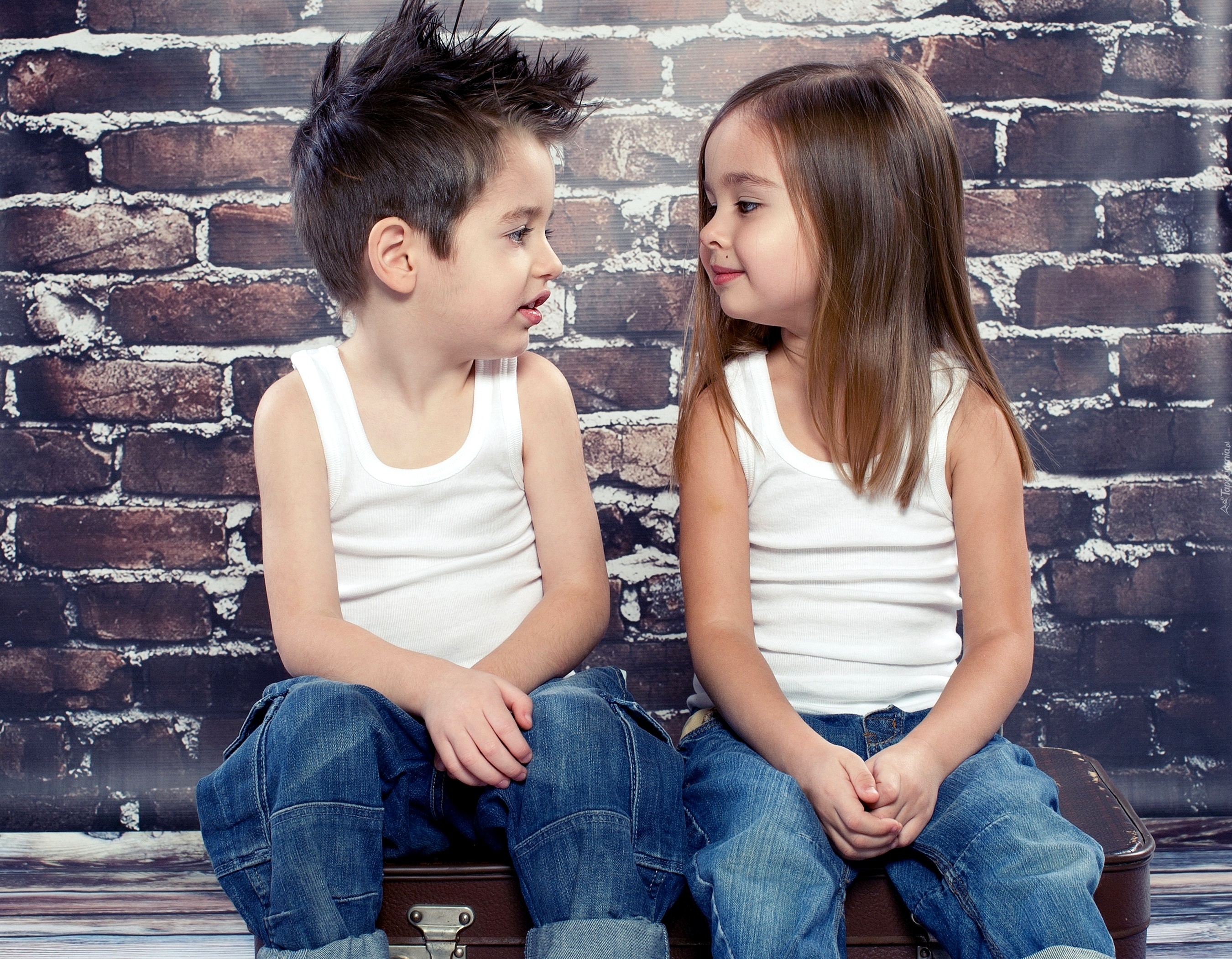 Edytor tapety: Siedząca, Dziewczynka, Chłopiec, Mur