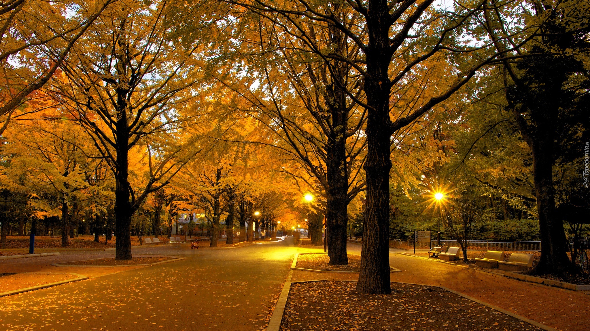 Edytor tapety: Jesień, Park, Droga, Drzewa, Latarnie