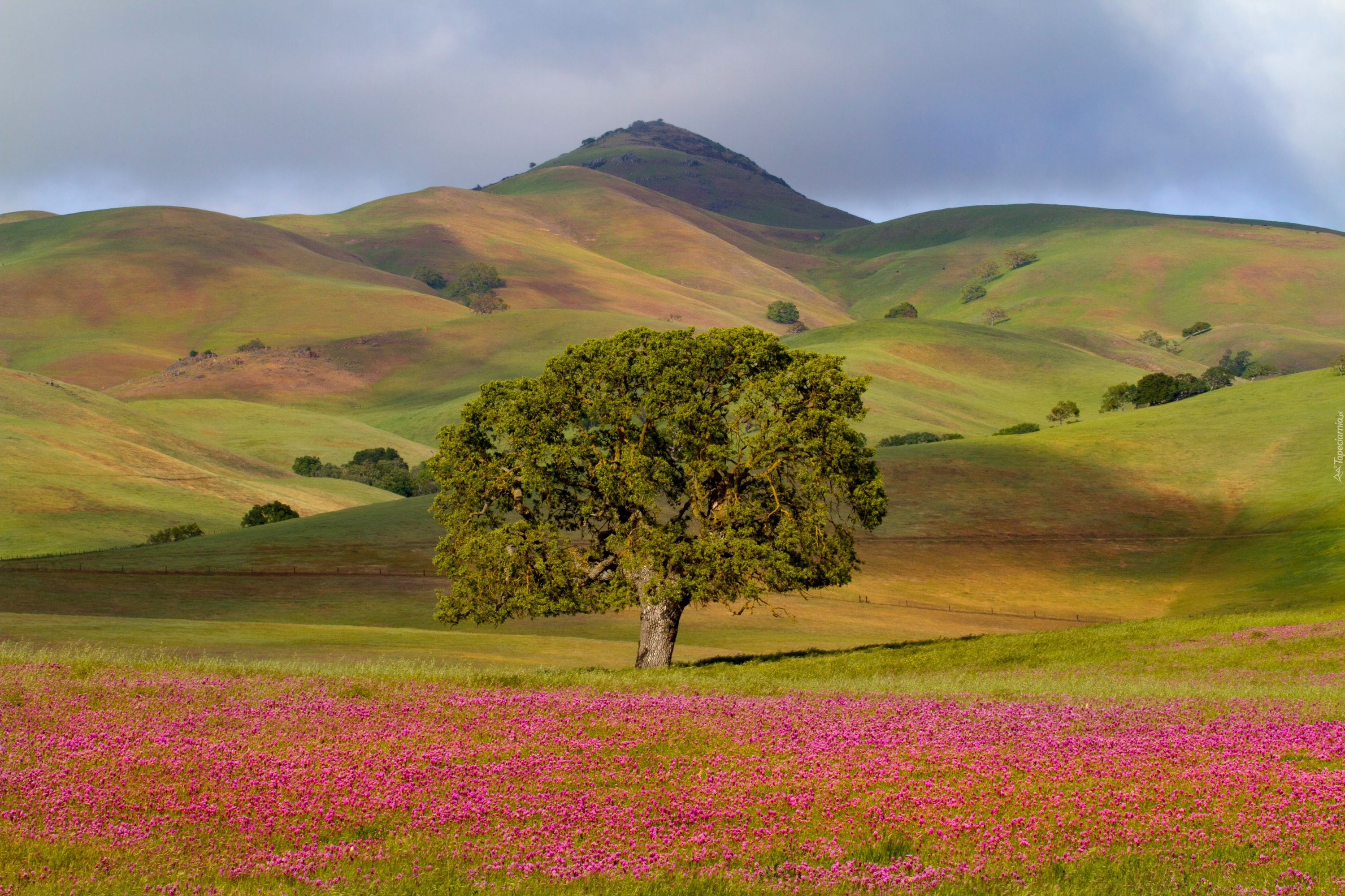 Edytor tapety: Łąka, Drzewo, Wzgórza