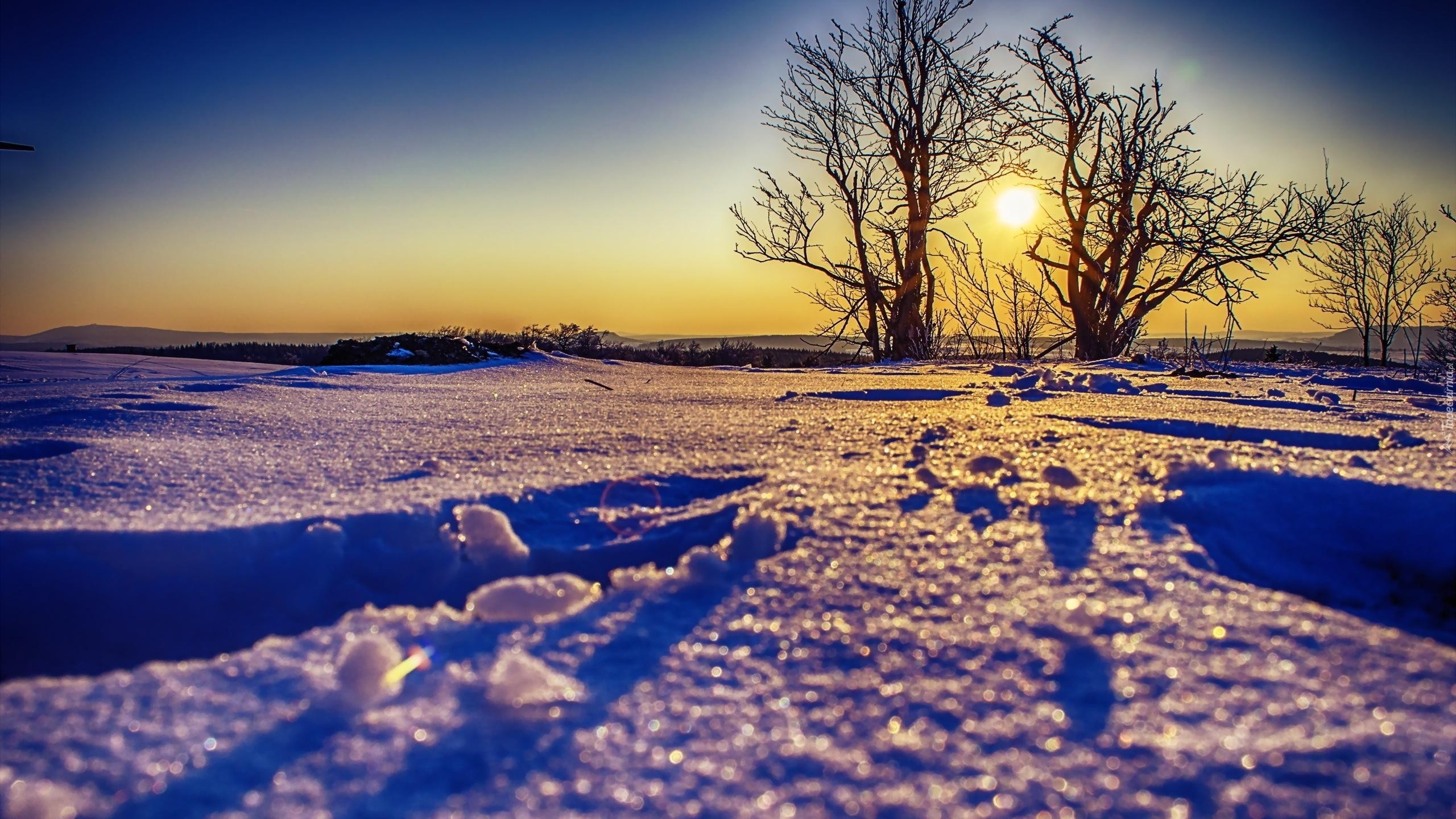 Edytor tapety: Zima, Drzewa, Wschód Słońca