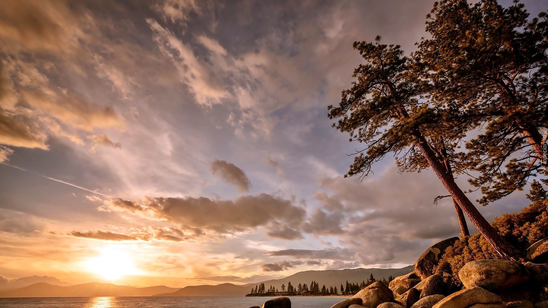Edytor tapety: Jezioro, Sosny, Kamienie, Niebo, Chmury, Wschód, Słońca