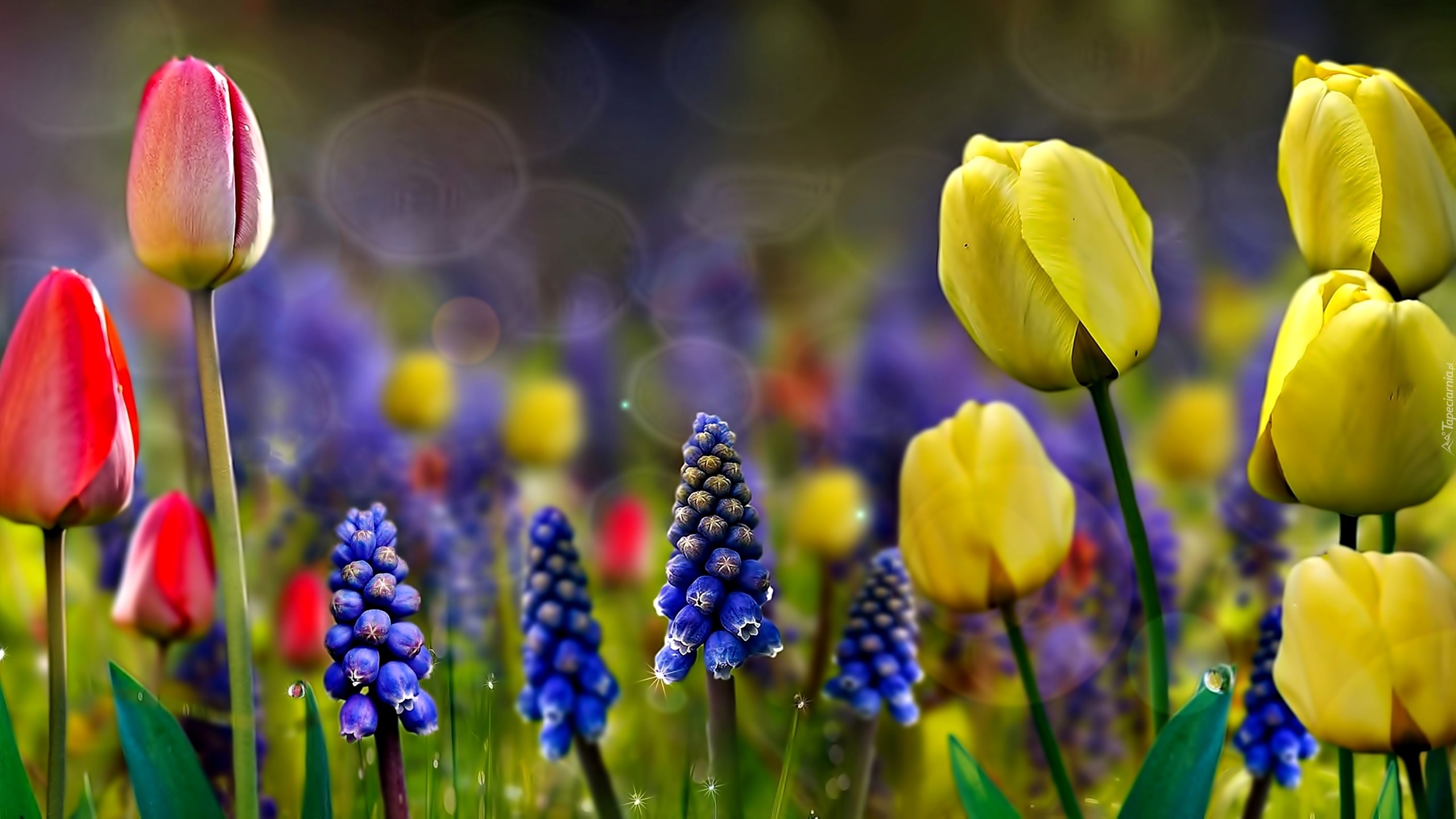 Edytor tapety: Wiosenne, Kwiaty, Tulipany, Szafirki