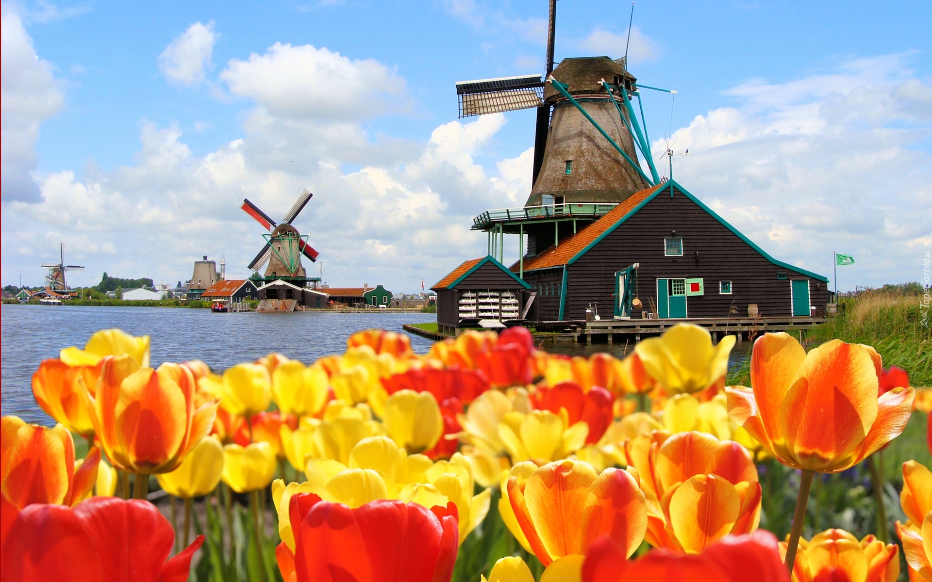 Edytor tapety: Wybrzeże, Domy, Wiatraki, Tulipany, Wiosna