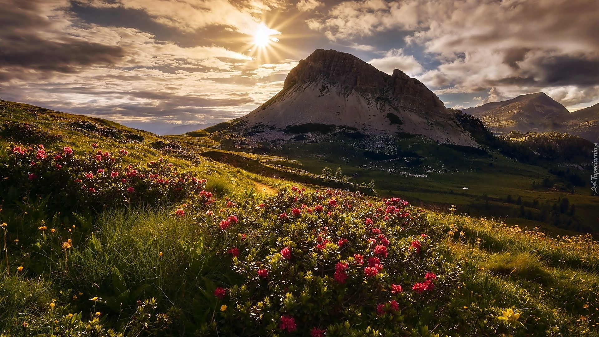 Edytor tapety: Wiosna, Góry, Chmury, Promienie, Słońca, Łąka, Rododendrony