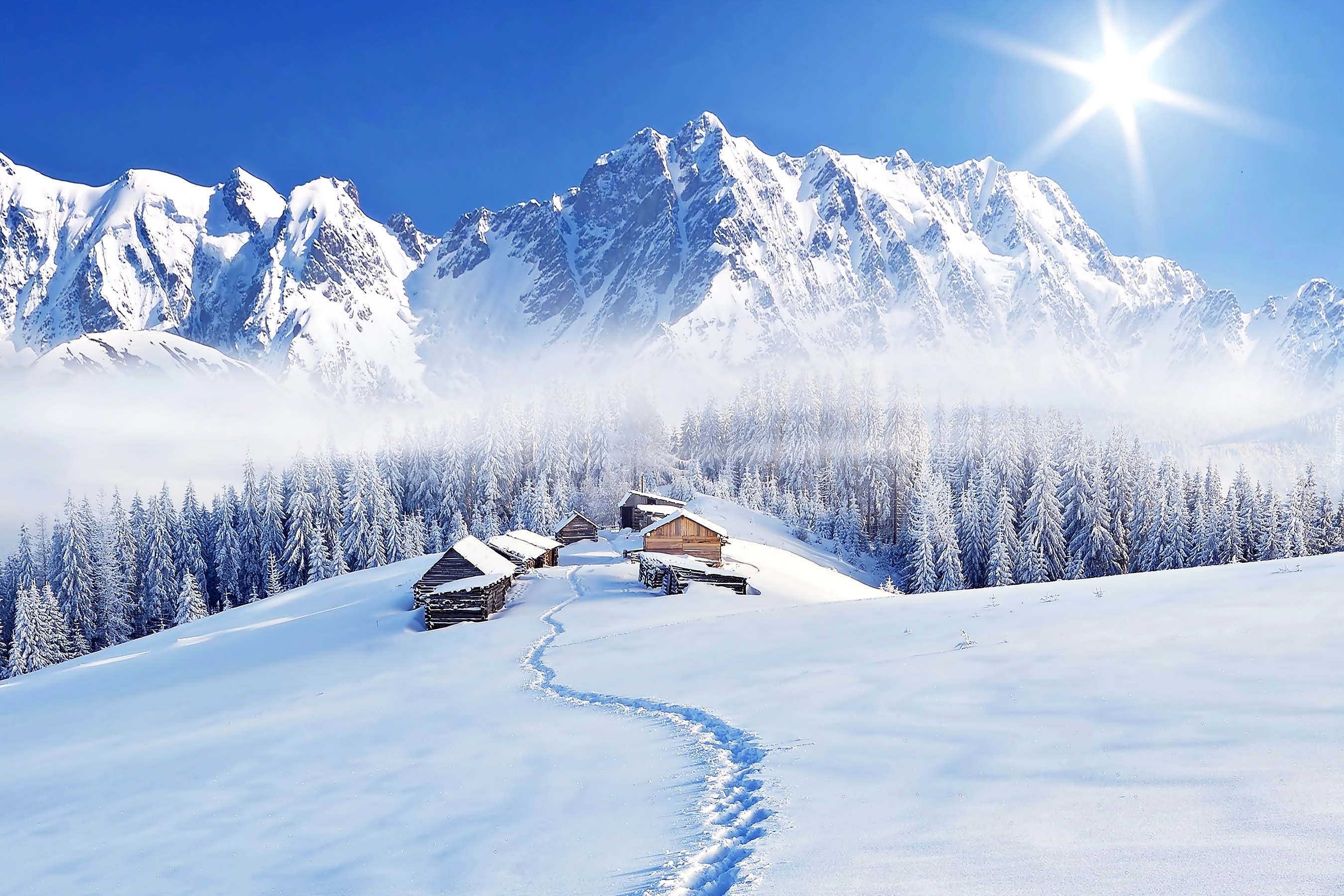 Edytor tapety: Zima, Góry, Las, Mgła, Promienie, Słońca, Domy