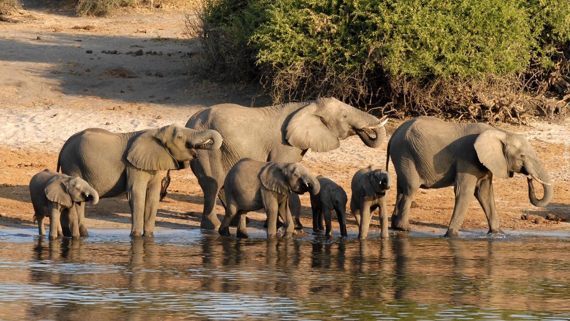 Edytor tapety: Stado, Słoni, Rzeka, Brzeg, Zarośla