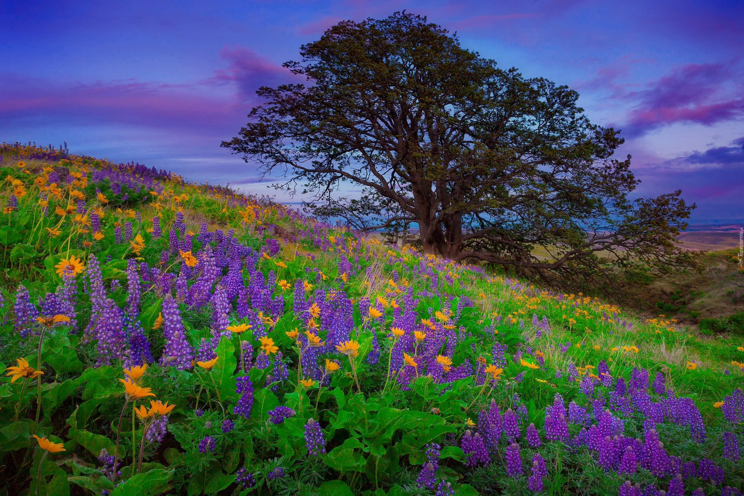 Edytor tapety: Góry, Drzewo, Łąka, Kwiaty, Wiosna