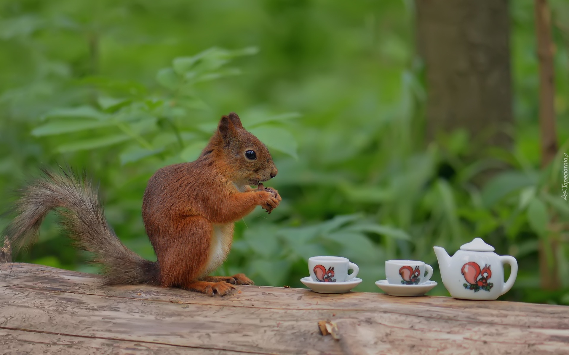Edytor tapety: Wiewiórka, Dwie, Filiżanki, Imbryk, Las