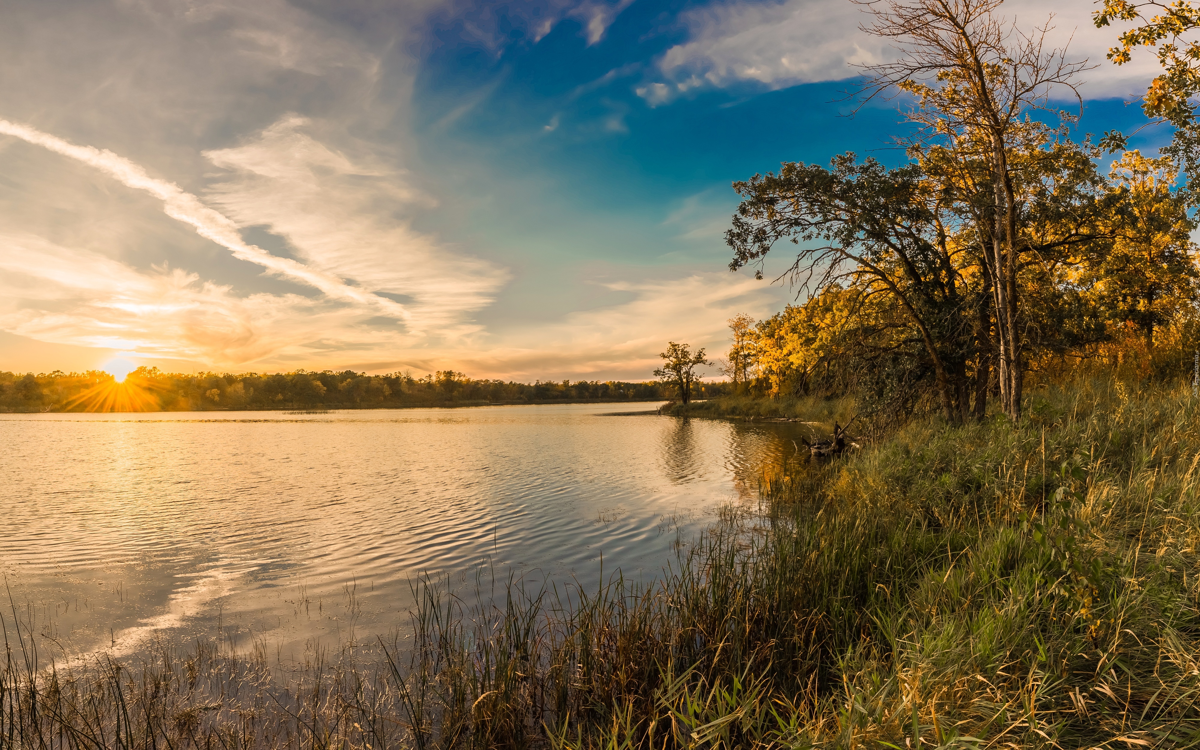Edytor tapety: Jezioro, Wschód słońca, Niebo, Drzewa, Trawa