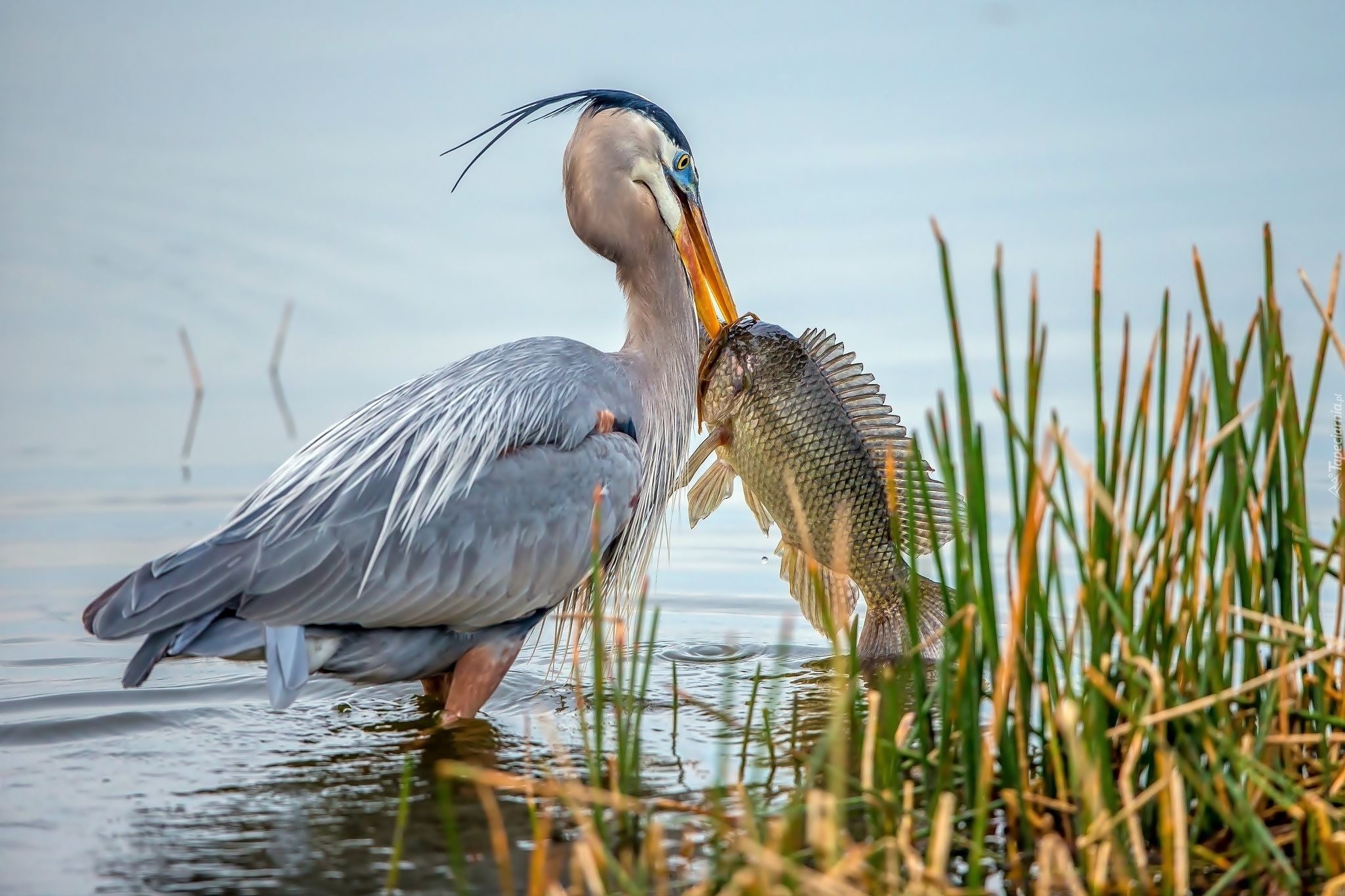 Edytor tapety: Czapla, Rybka, Trawa, Jezioro