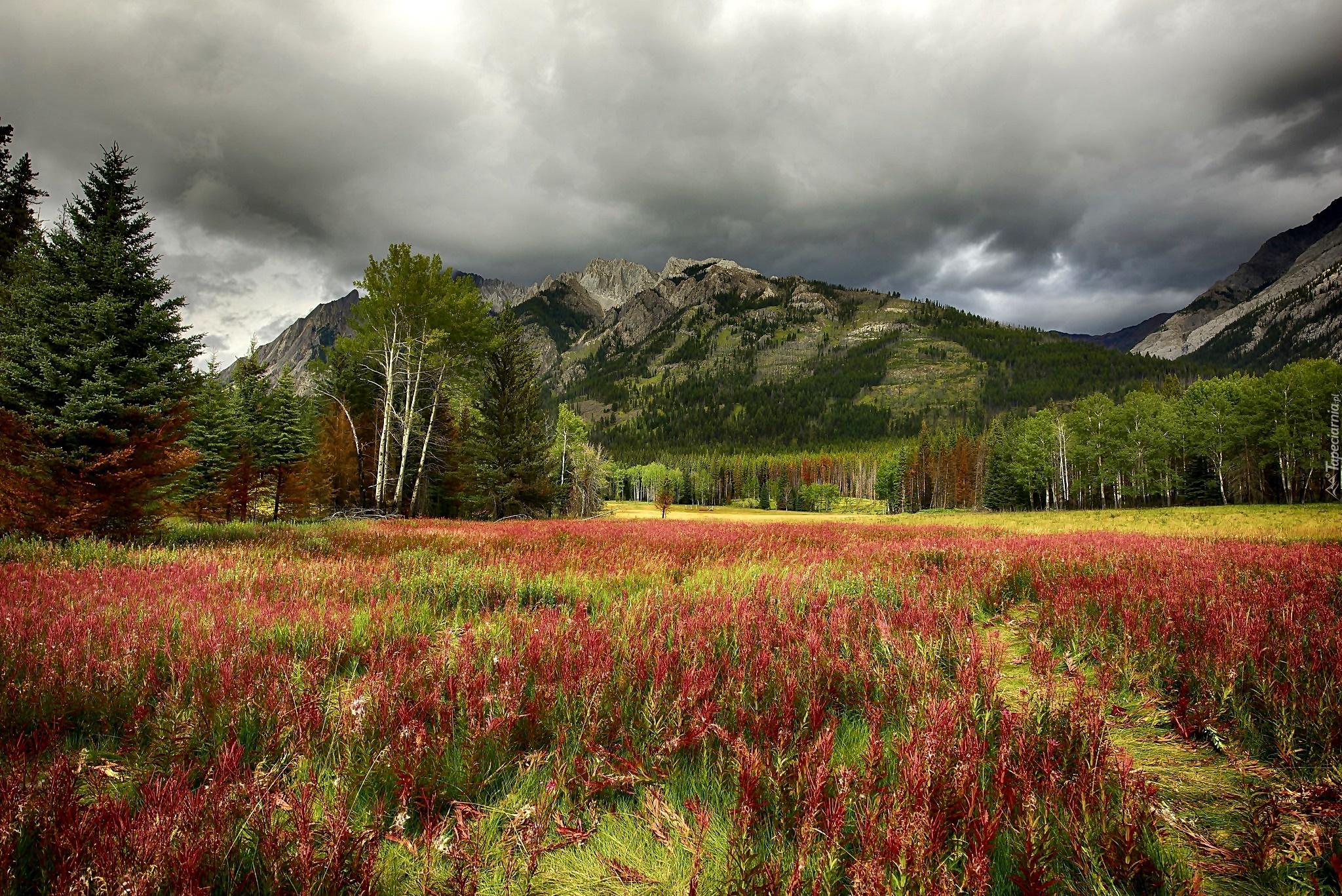 Edytor tapety: Kwitnąca Trawa, łąka, Las, Góry, Zachmurzone Niebo