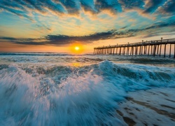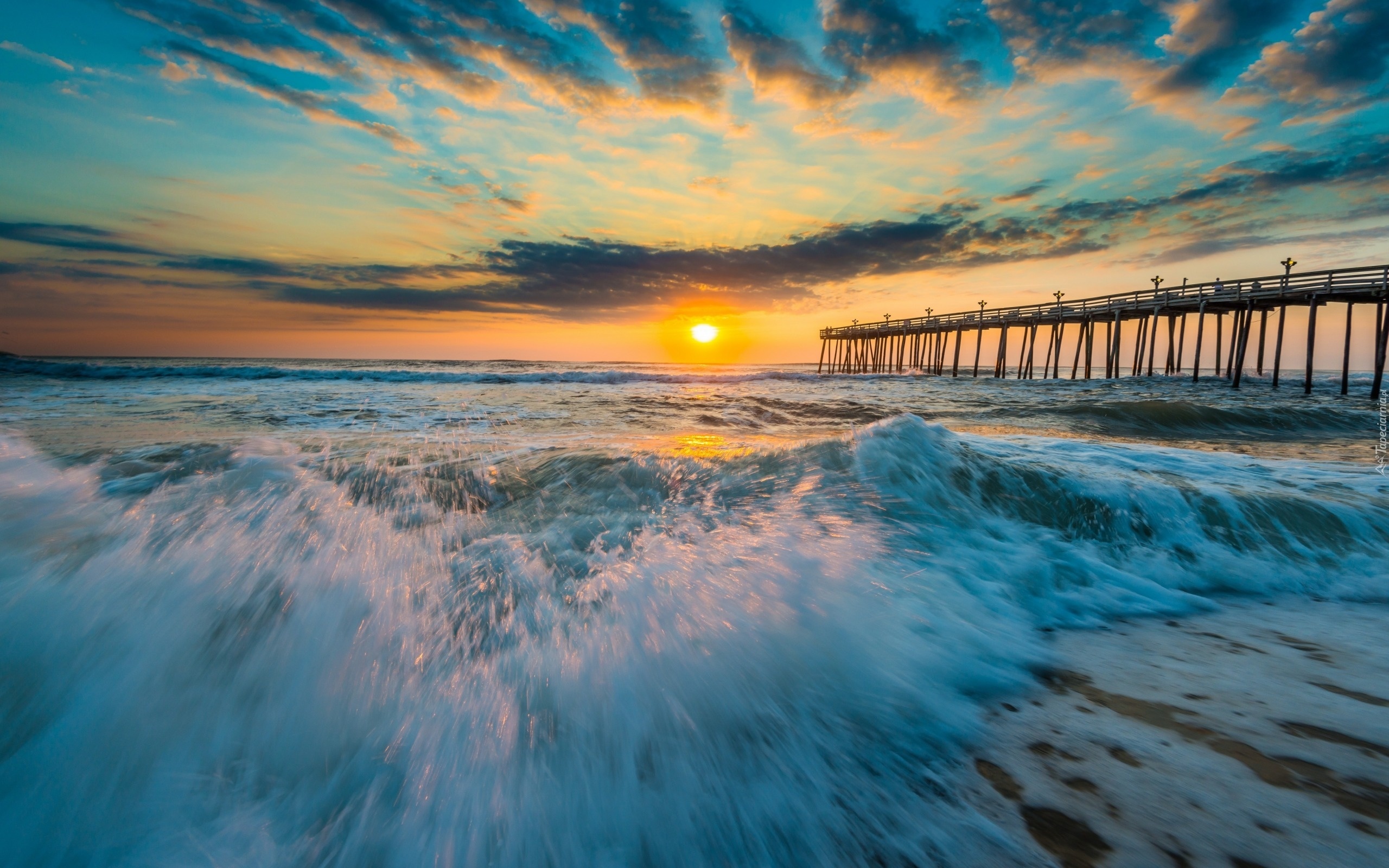 Edytor tapety: Morze, Fale, Molo, Zachód Słońca, Chmury