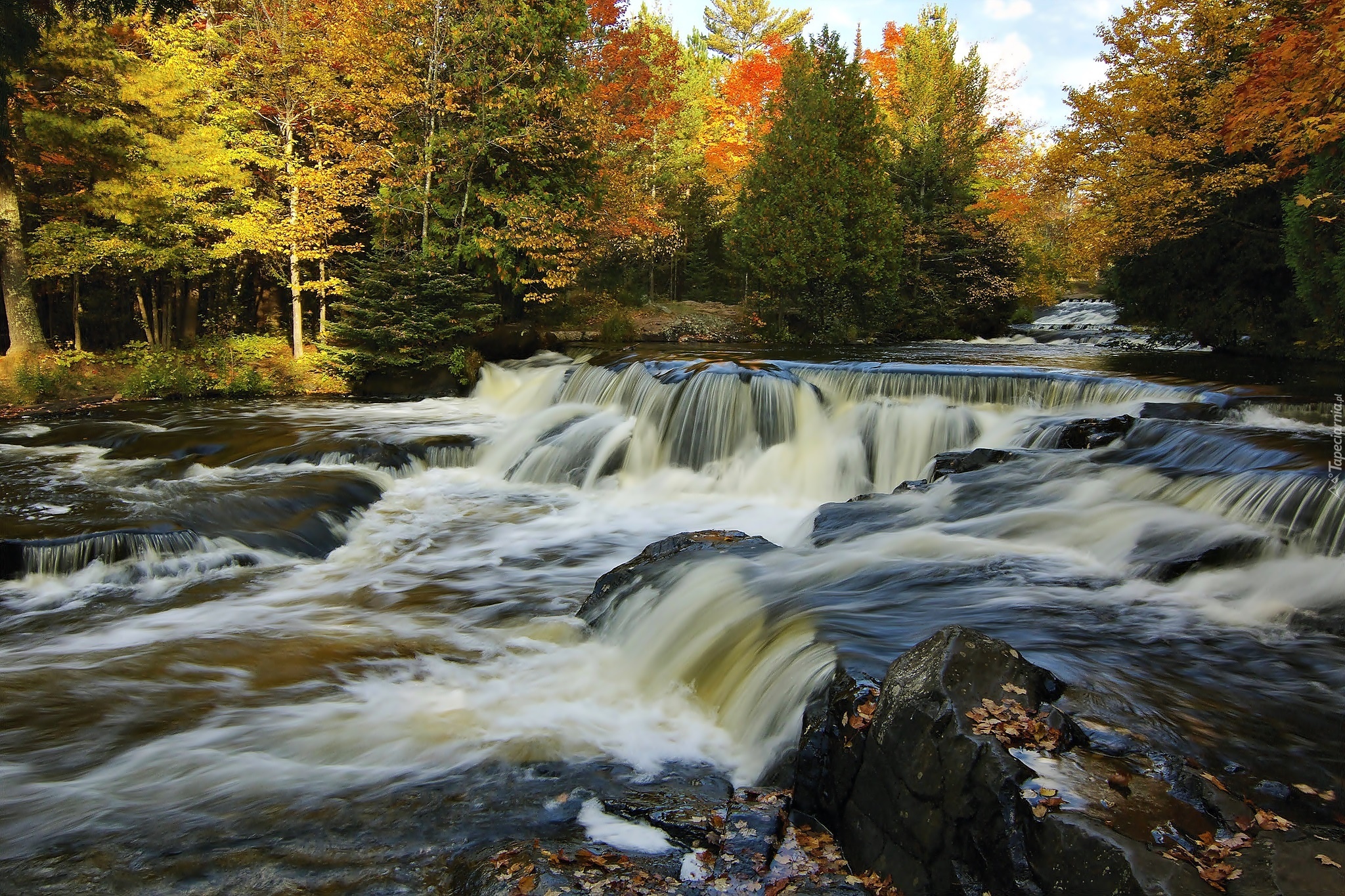 Edytor tapety: Jesień, Las, Rzeka, Wodospad, Światło, Cień