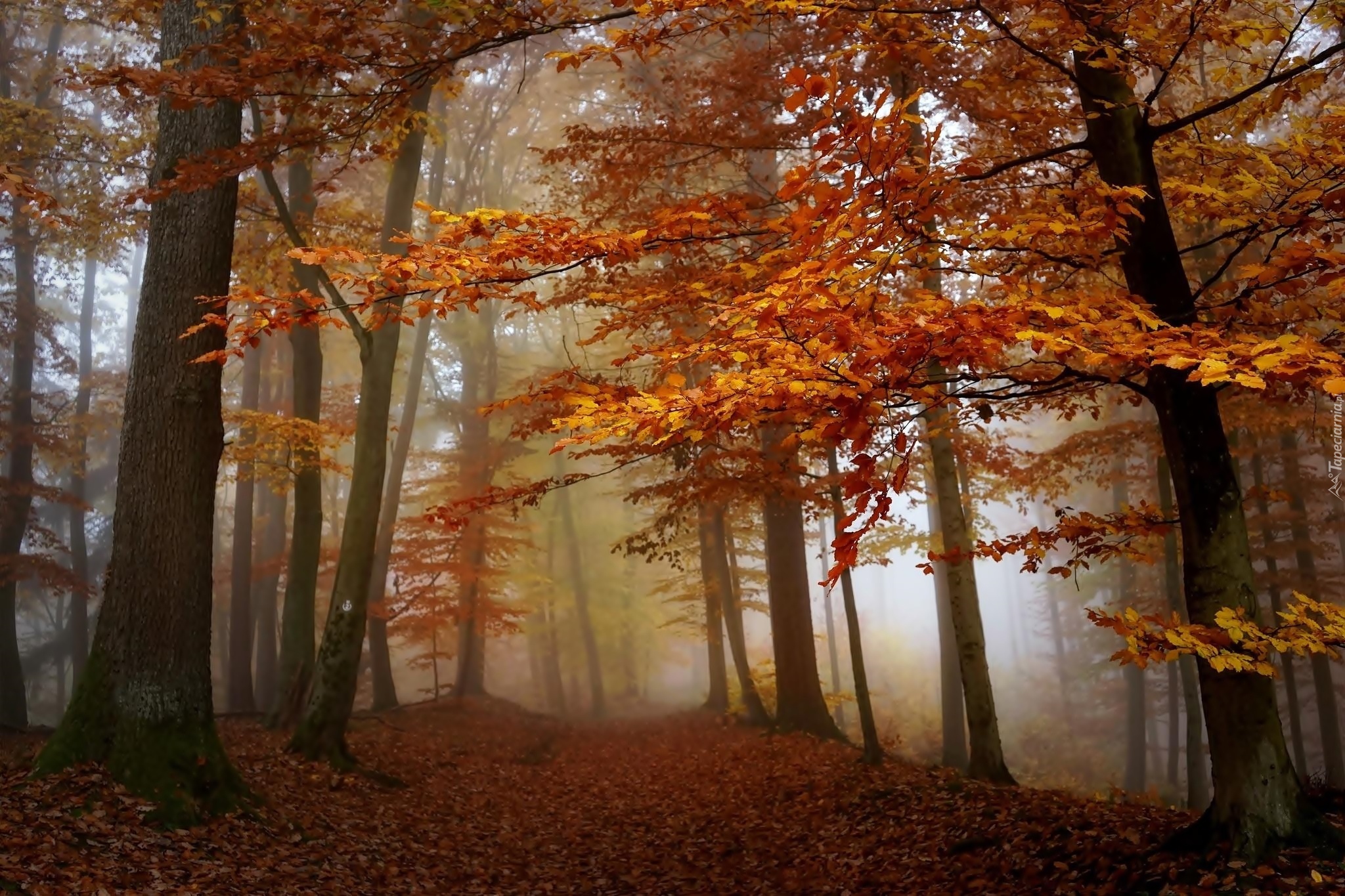 Edytor tapety: Las, Droga, Liście, Mgła, Jesień