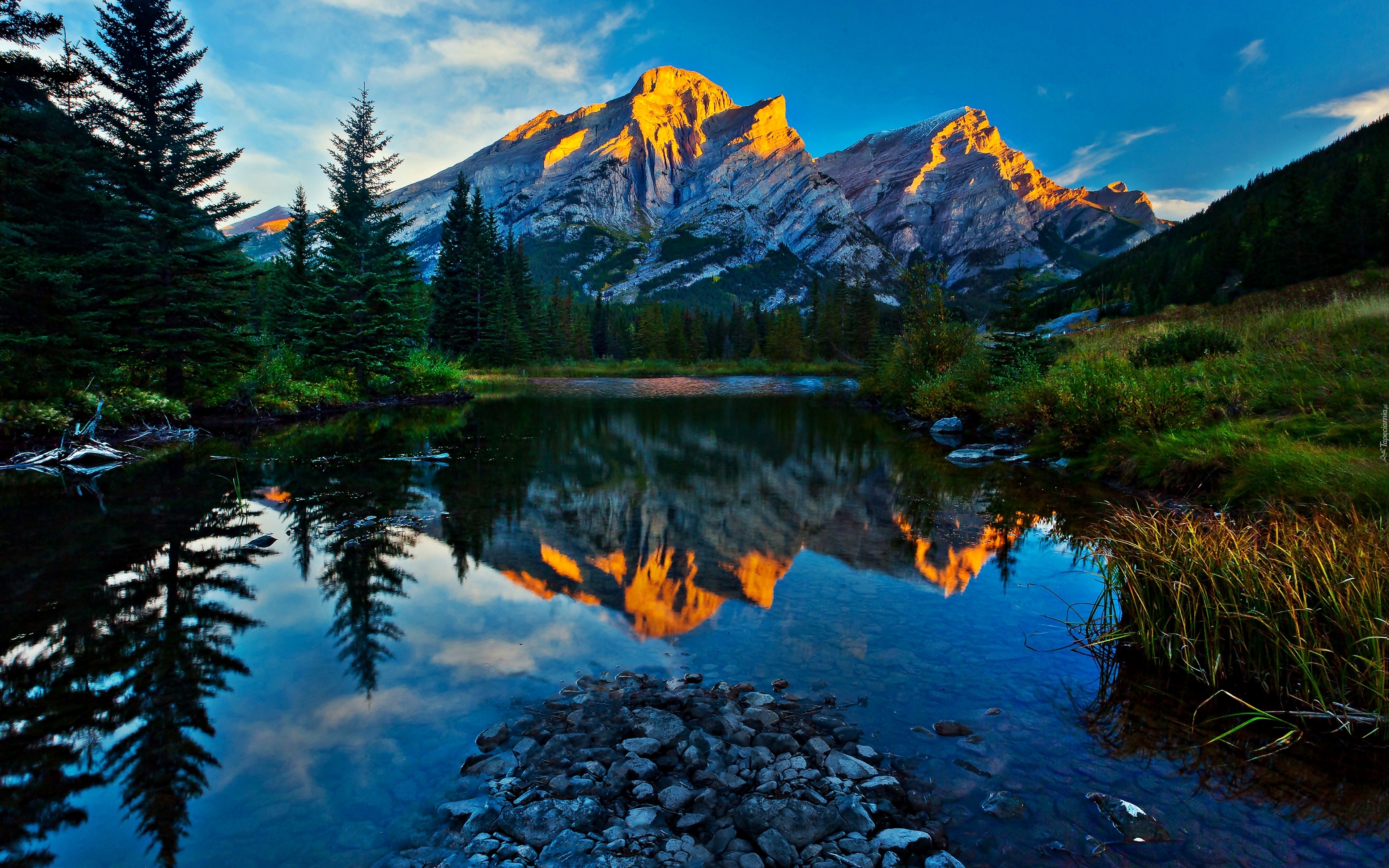 Edytor tapety: Góry, Jezioro, Świerki, Światło, Cień, Odbicie
