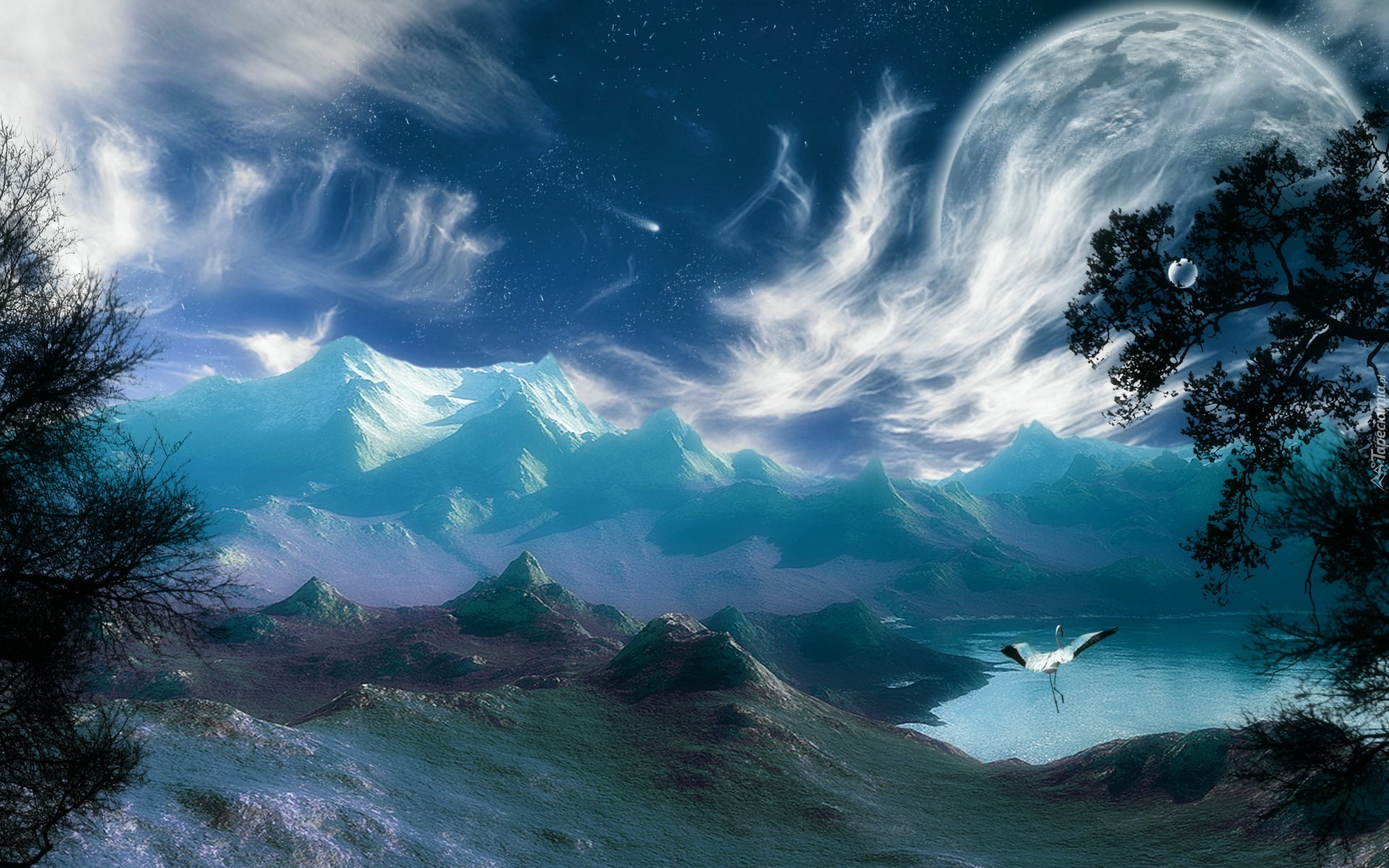 Edytor tapety: Góry, Drzewa, Niebo, Bocian