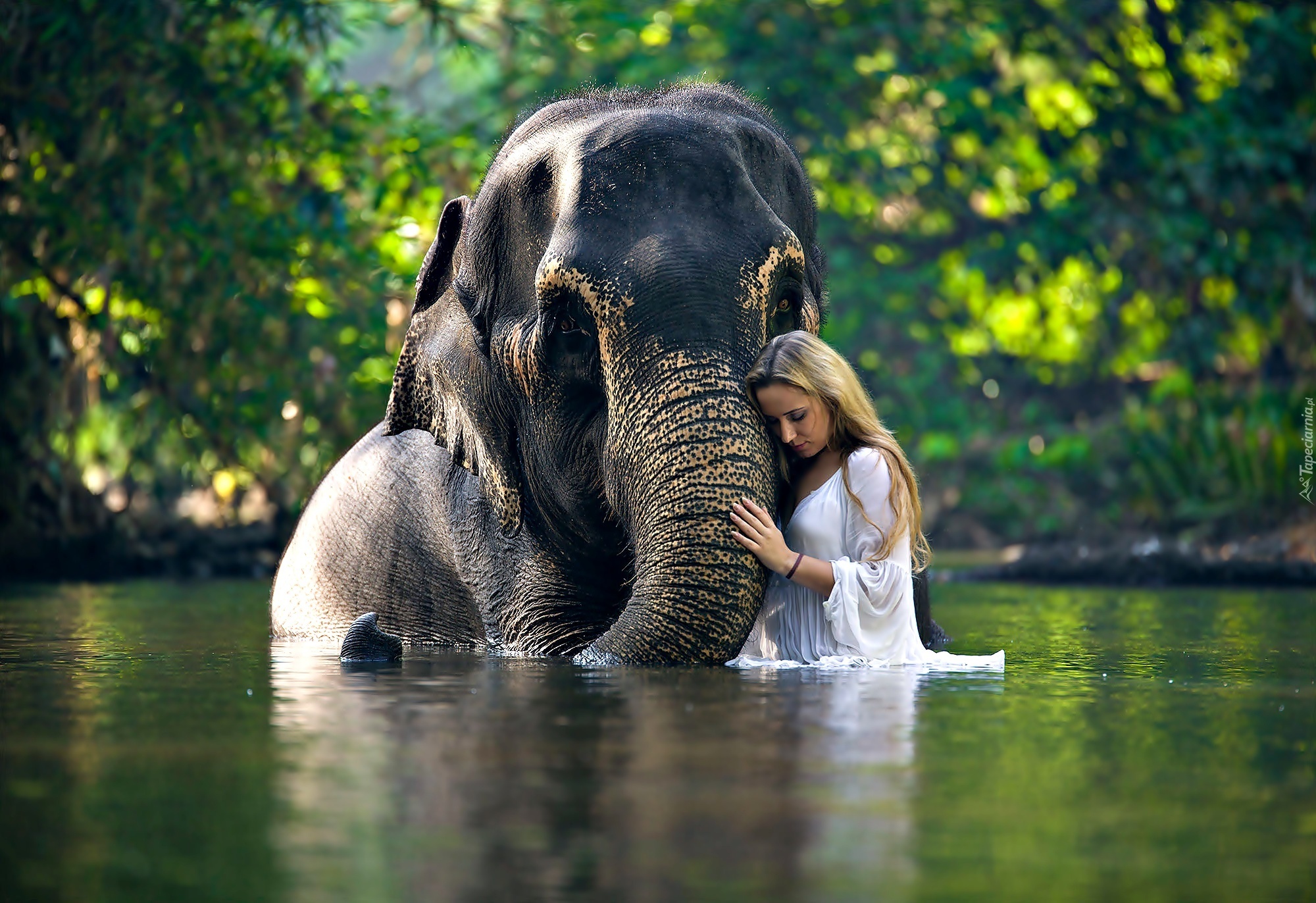 Edytor tapety: Słoń, Kobieta, Woda, Zieleń