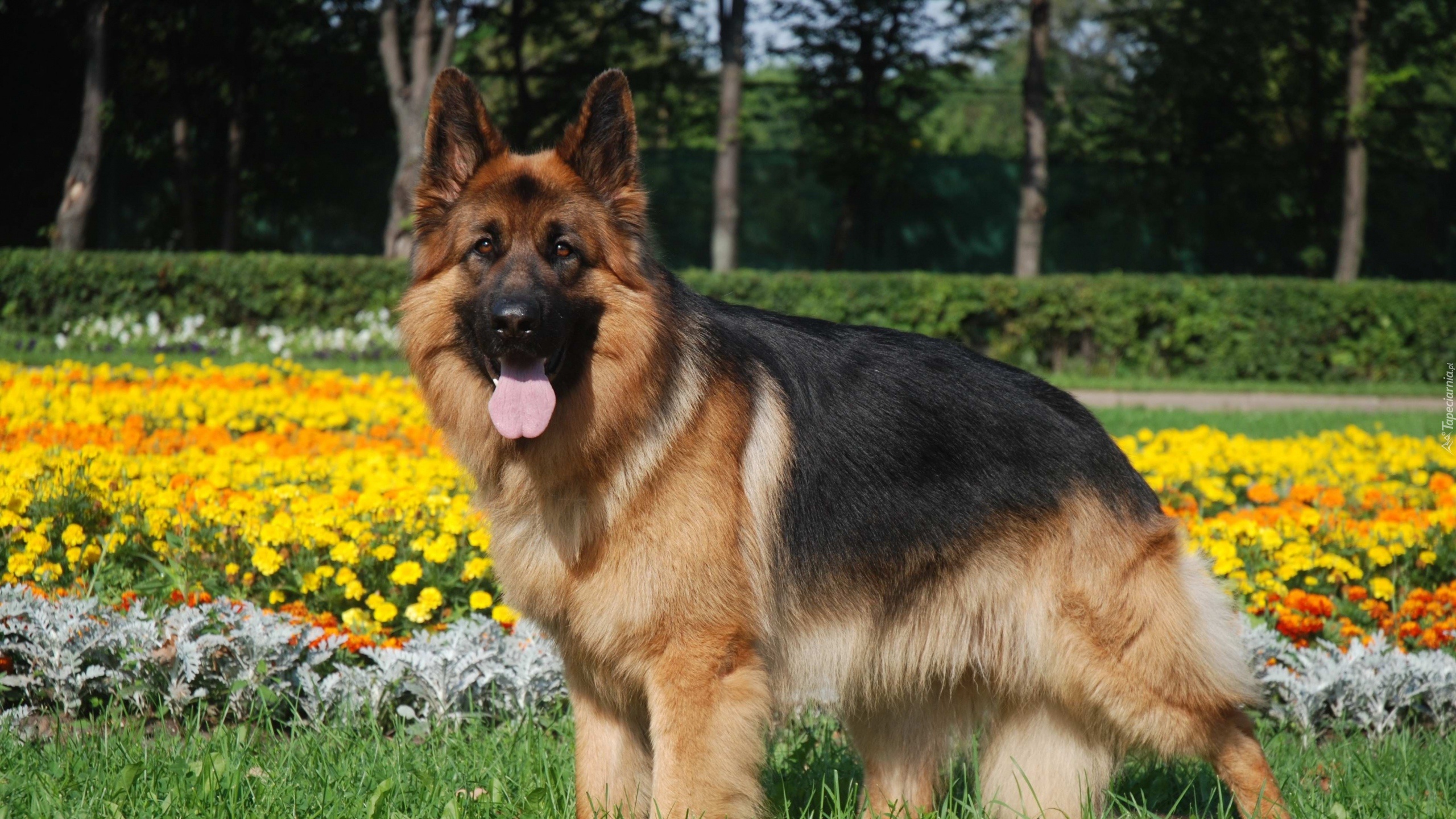 Edytor tapety: Owczarek, Niemiecki, Kwiaty, Drzewa