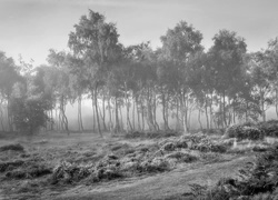 Edytor tapety: Anglia, Hrabstwo Derbyshire, Obszar wyżynny Stanton Moor, Park Narodowy Peak District, Drzewa, Brzozy, Wrzosowisko, Mgła, Świt