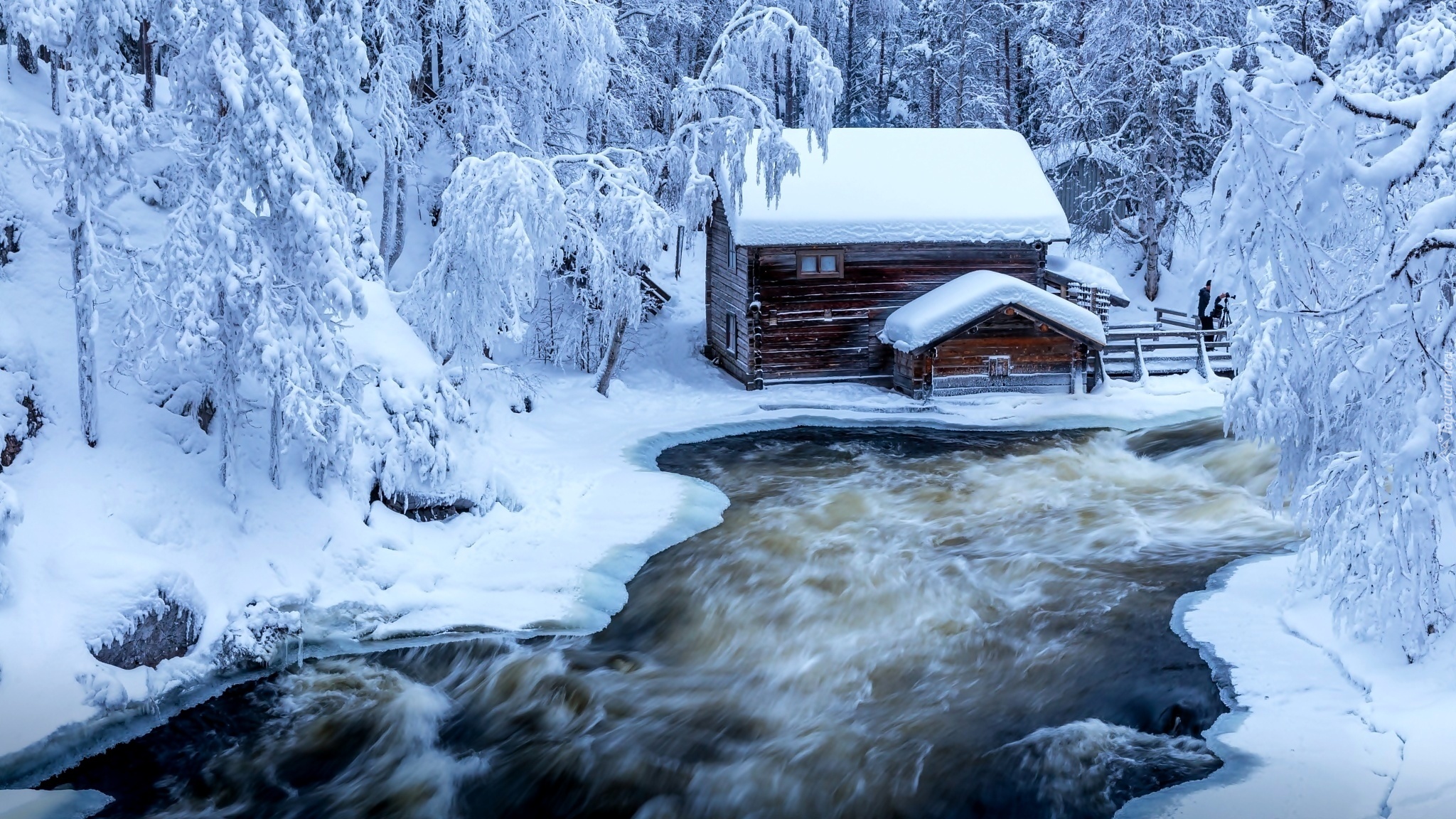 Edytor tapety: Zima, Dom, Rzeczka, Ośnieżone, Drzewa