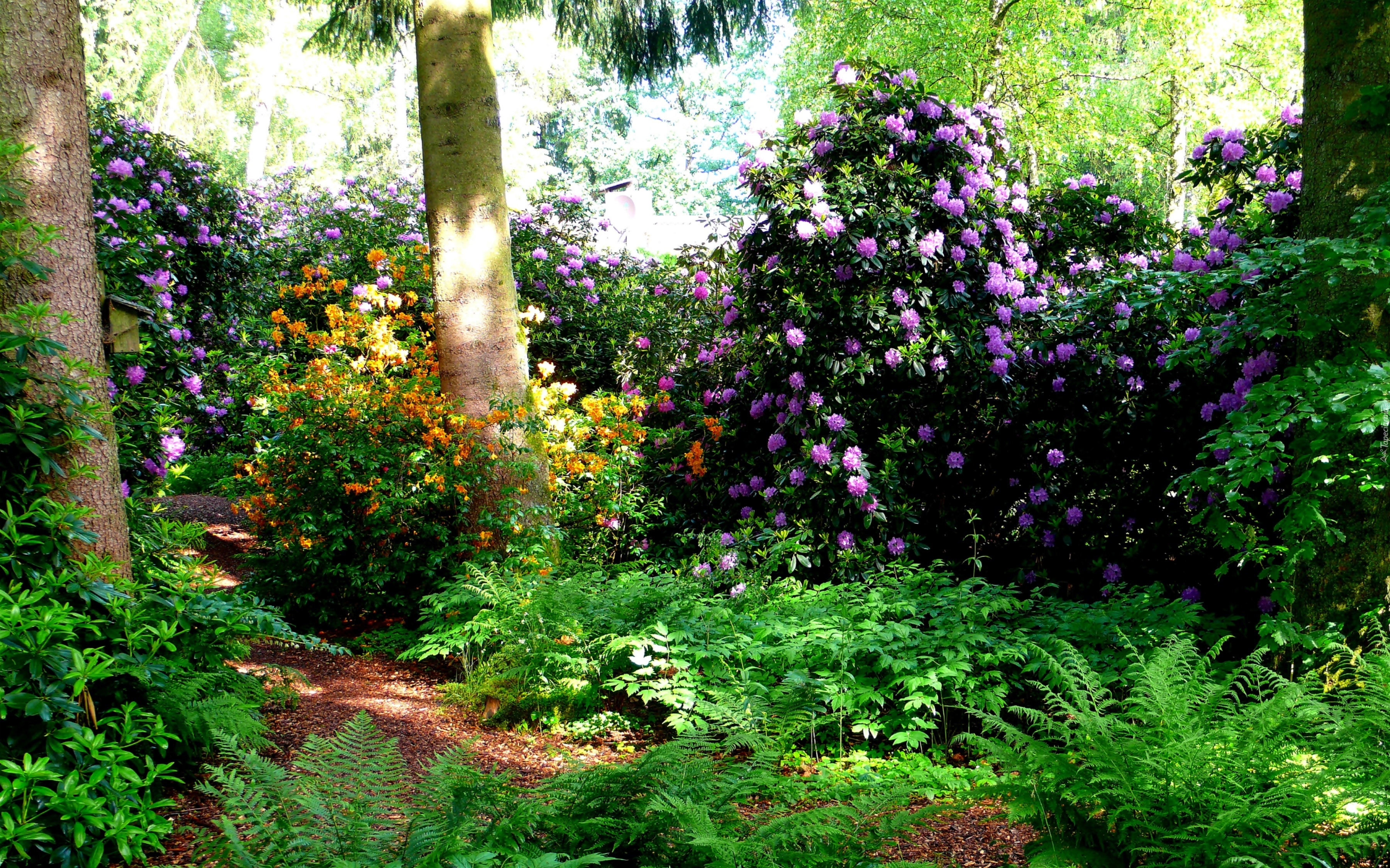 Edytor tapety: Kwiaty, Krzewy, Rododendron, Paprocie, Ścieżka, Park, Wiosna, Szwajcaria