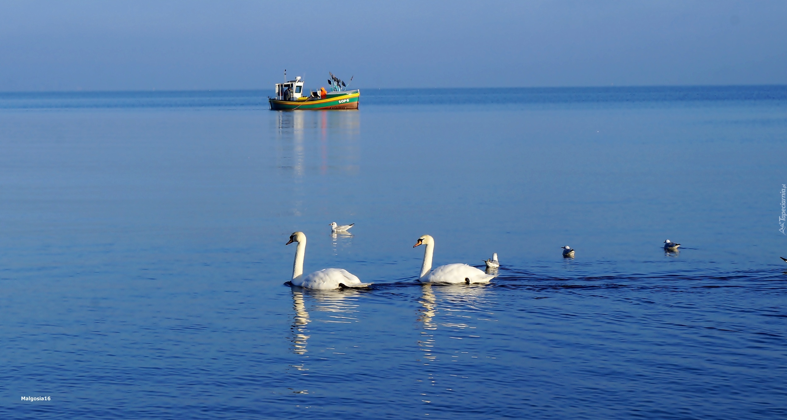 Edytor tapety: Białe, Ptaki, Łabędzie, Woda, Kuter, Rybacki