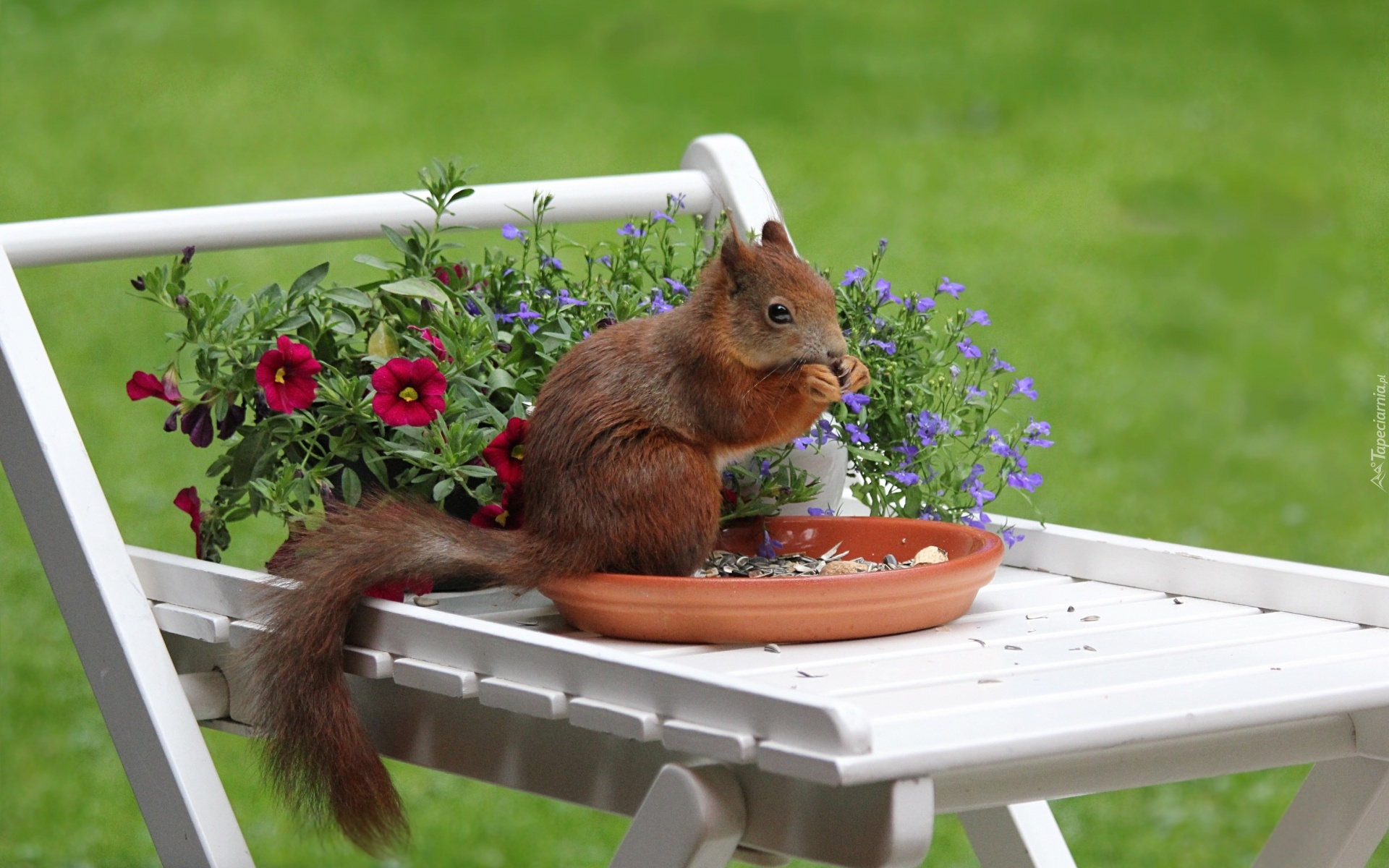 Edytor tapety: Wiewiórka, Tacka, Słonecznik, Mebel, Ogrodowy, Kwiaty