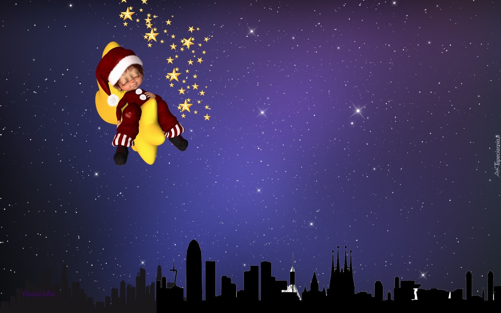 Edytor tapety: Grafika, Noc, Księżyc, Gwiazdy, Laleczka, Domy