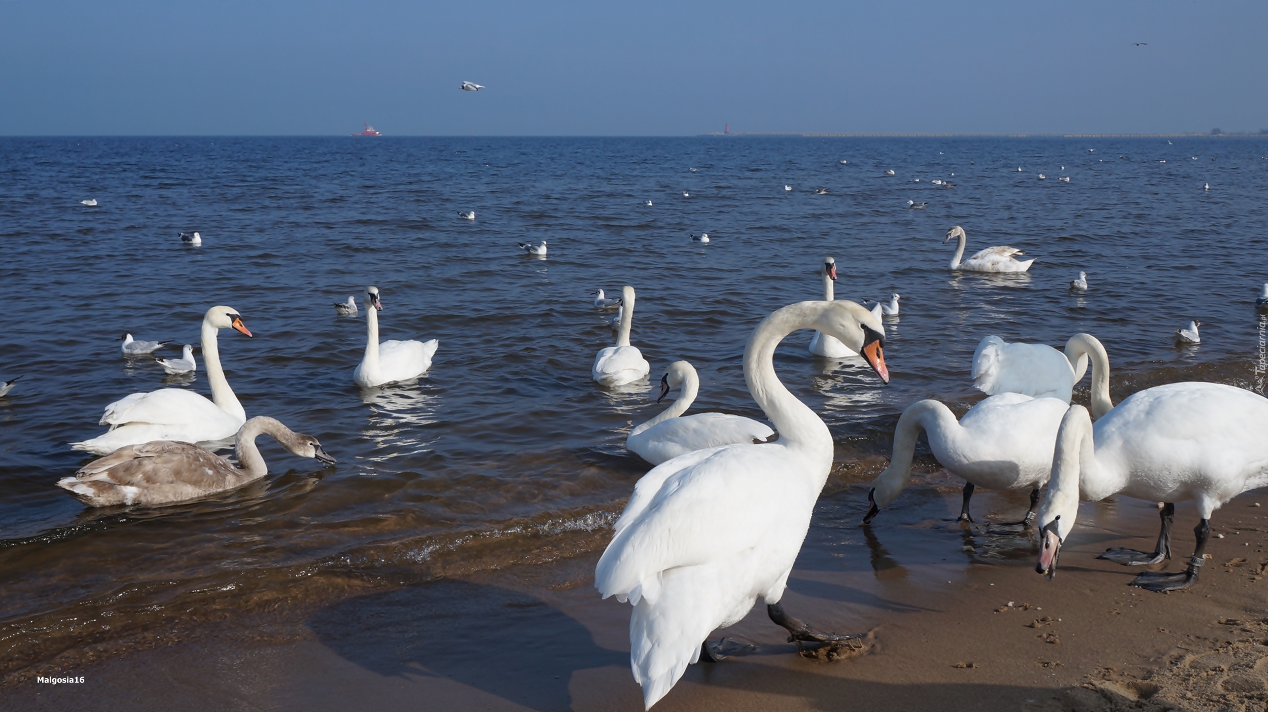 Edytor tapety: Białe, Ptaki, Łabędzie, Morze, Plaża