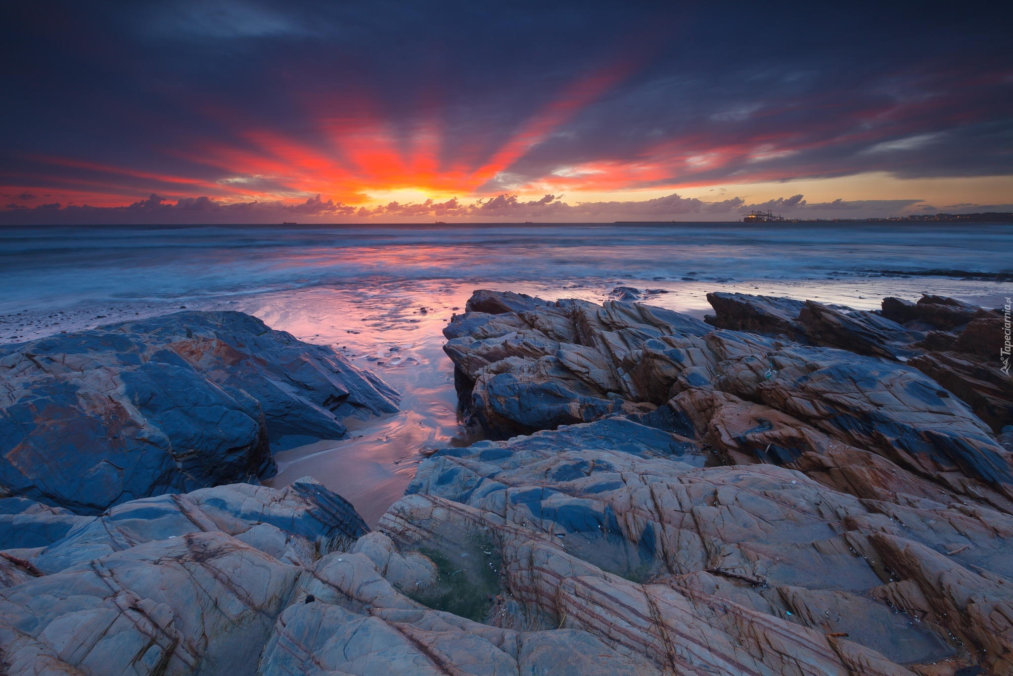 Edytor tapety: Zachód Słońca, Skały, Morze