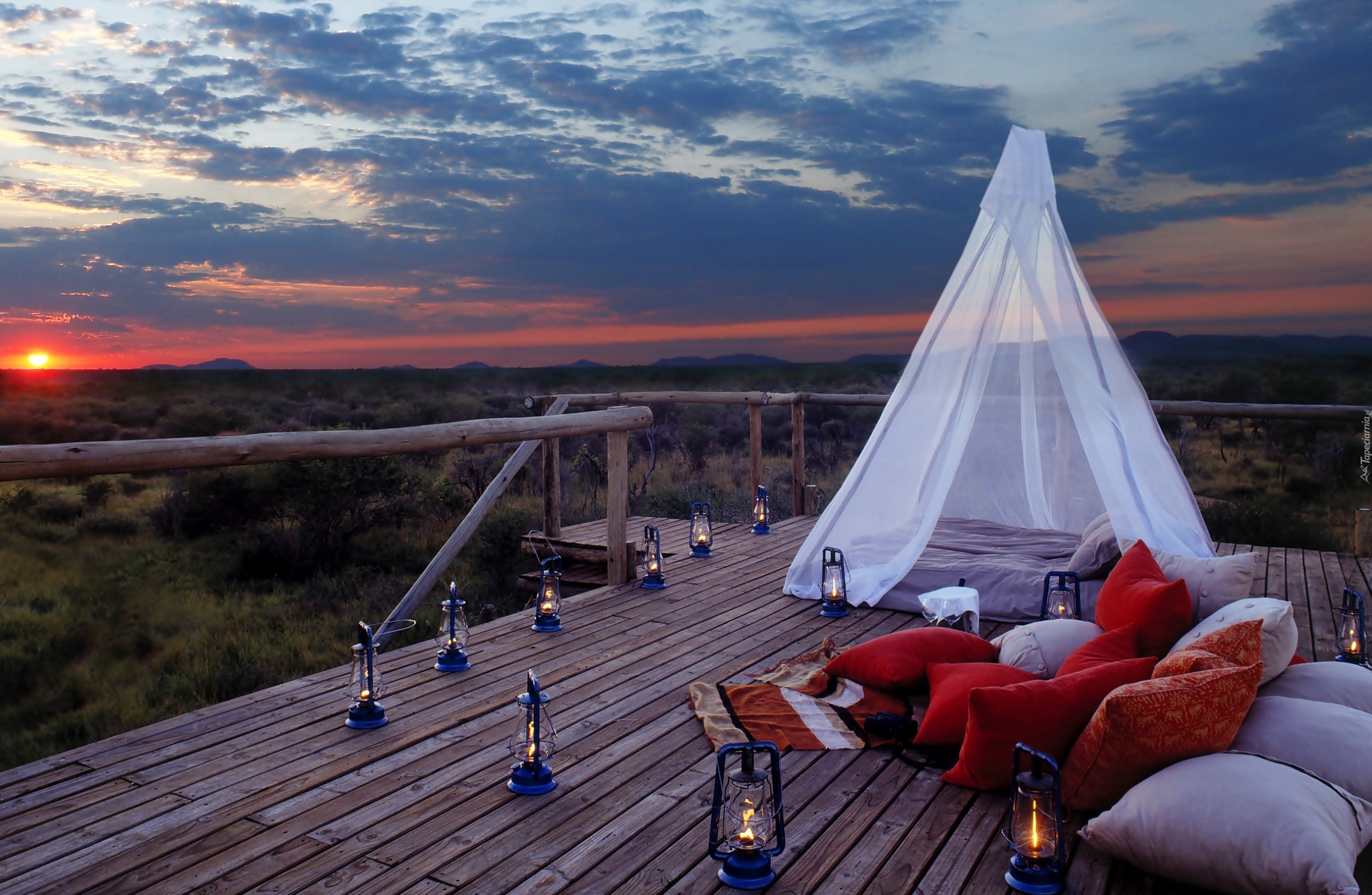 Edytor tapety: Wieża, Obserwacyjna, Lampiony, Zachód, Słońca, Krajobraz, Safari