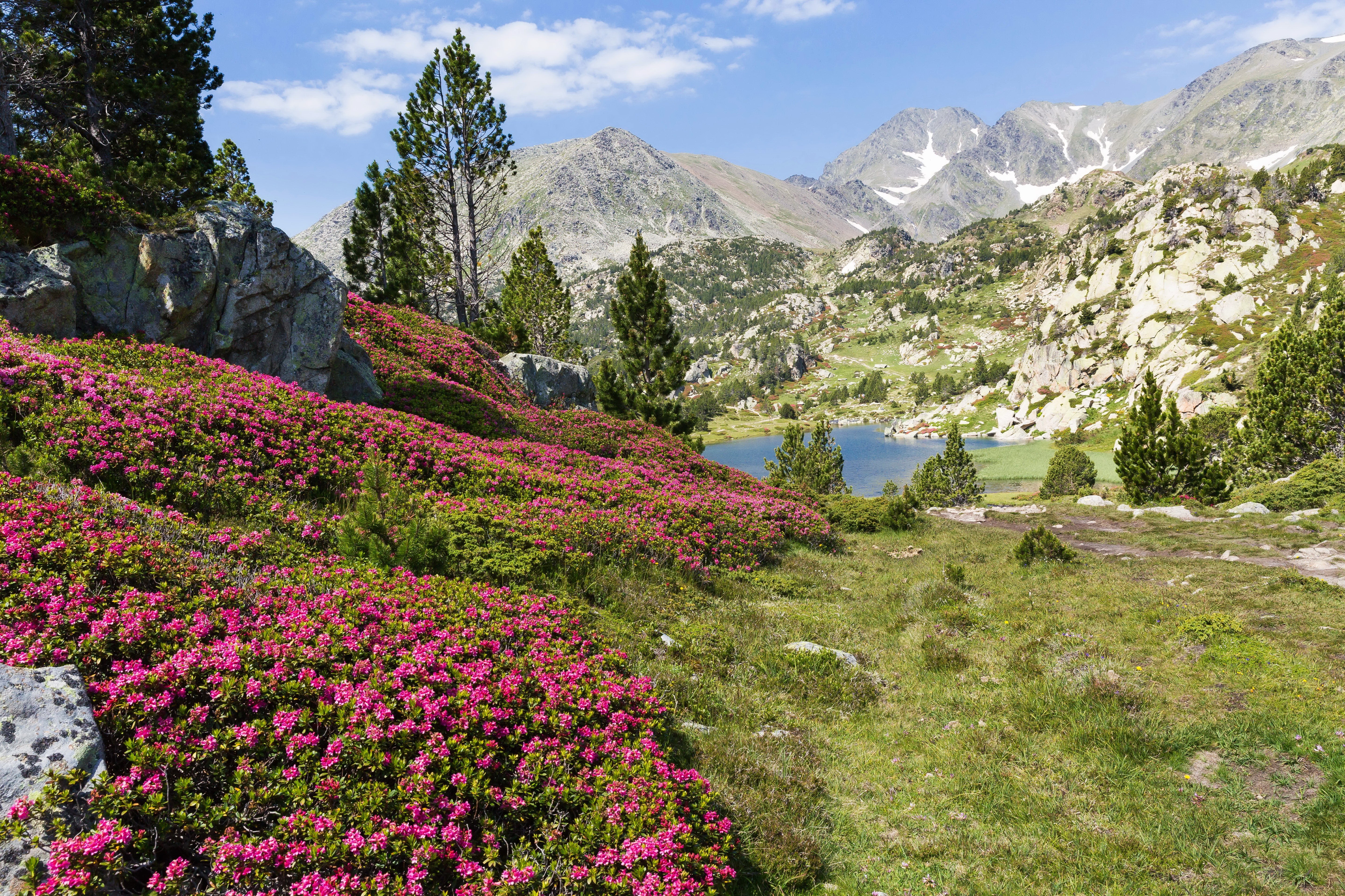 Edytor tapety: Wiosna, Góry, Jezioro, Łąk, Rododendrony