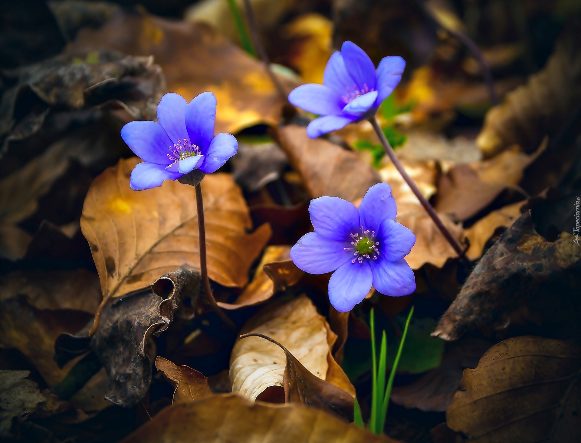 Edytor tapety: Niebieskie, Kwiaty, Przylaszczki, Suche, Liście