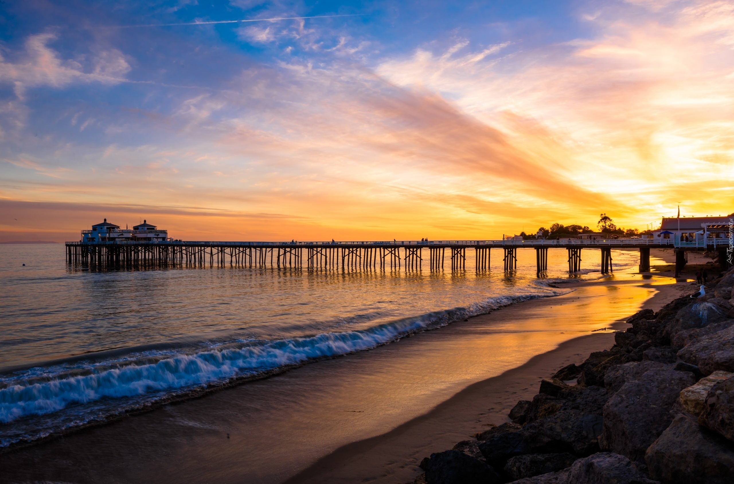 Edytor tapety: Wschód słońca, Morze, Molo, Kamienie