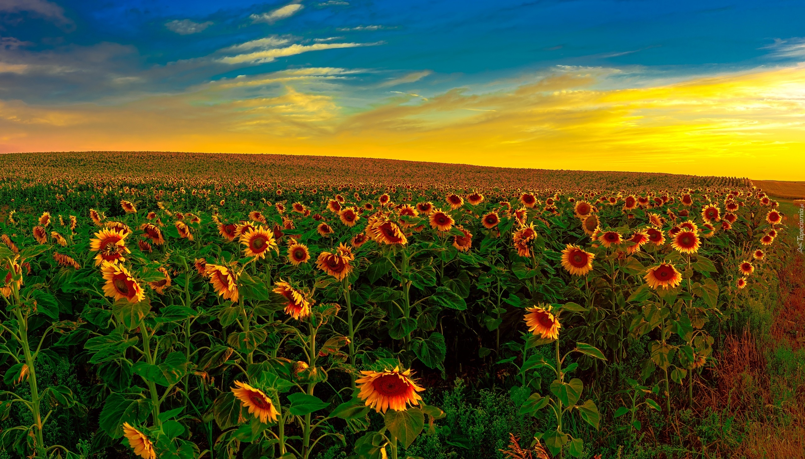Edytor tapety: Wschód słońca, Pole, Słoneczniki Słonecznik ozdobny